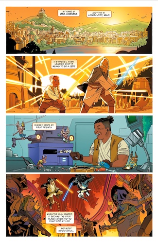 The High Republic Adventures (2023) #12 begins with a flashback to Jedi Padawan Ram Jomaram’s youth in Lonisa City on the planet Valo. In voice-over dialogue boxes, Ram reminisces about his love of this world and the memories he accumulated there, including more recent events during the war against the malicious band of marauders known as the Nihil. In the present, the Nihil have invaded Valo once again (after they were eliminated from the planet in author Daniel Jose Older’s middle-grade novel Star Wars: The High Republic - Escape from Valo) and now Ram finds himself aboard the former Jedi cruiser known as the Star Hopper, which has been commandeered for use by the Nihil. But Ram and his friends manage to win the fight aboard the vessel and retake it, with their focus then shifting to the surface below.