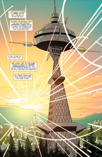 At Crashpoint Tower, poor Padawan Gavi is being held hostage by the menacing being known only as the Warden and is forced to transmit a message of surrender as the Scarlet Skull– once a symbol of hope and resistance for Valo. But when Ram hears this transmission, he comes up with a plan. Meanwhile, Jomaram’s pirate allies Therm Scissorpunch (of the Nephran species) and Drrn (a Muun) attempt to infiltrate the planet’s occupied Jedi Temple. In the air above, Ram is accompanied by his trusty droid V-18 and the Bonbrak mechanics as they hack into the tower’s signal, interrupting the Nihil Broadcast and sending out one of Ram’s own. This inspires some hope around Valo, but soon Therm calls Ram with distressing information– the Warden is about to call for reinforcements. This news forces Jomaram’s hand in destroying Crashpoint Tower once and for all.