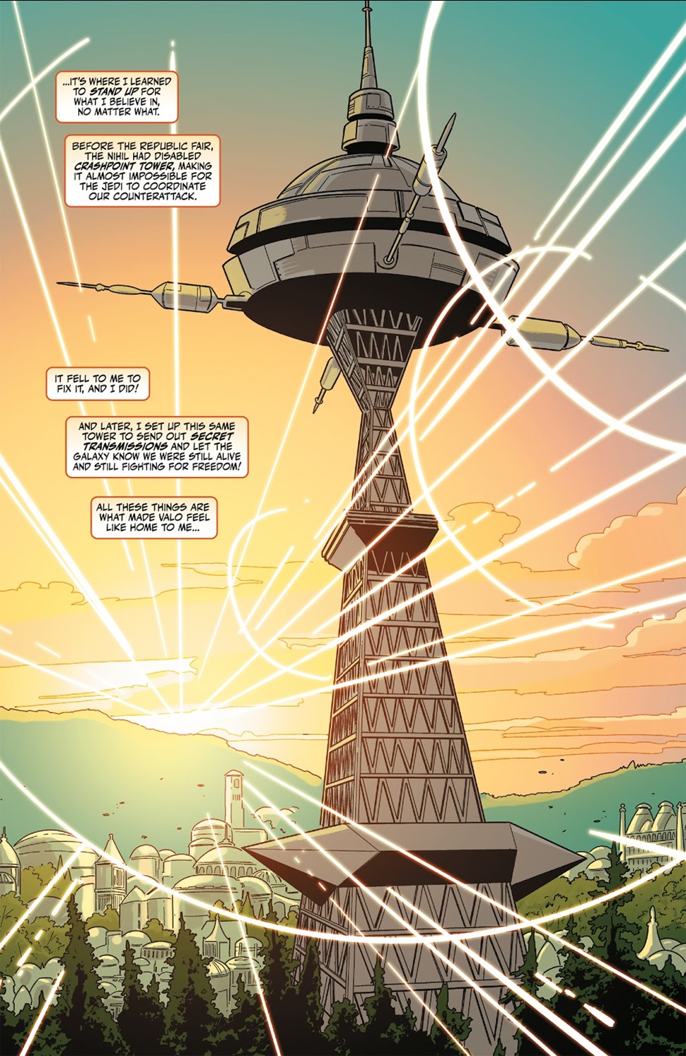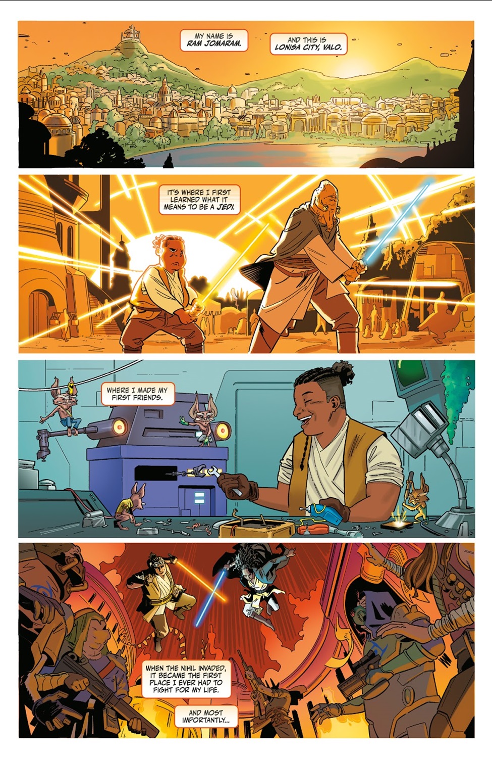 The High Republic Adventures (2023) #12 begins with a flashback to Jedi Padawan Ram Jomaram’s youth in Lonisa City on the planet Valo. In voice-over dialogue boxes, Ram reminisces about his love of this world and the memories he accumulated there, including more recent events during the war against the malicious band of marauders known as the Nihil. In the present, the Nihil have invaded Valo once again (after they were eliminated from the planet in author Daniel Jose Older’s middle-grade novel Star Wars: The High Republic - Escape from Valo) and now Ram finds himself aboard the former Jedi cruiser known as the Star Hopper, which has been commandeered for use by the Nihil. But Ram and his friends manage to win the fight aboard the vessel and retake it, with their focus then shifting to the surface below.