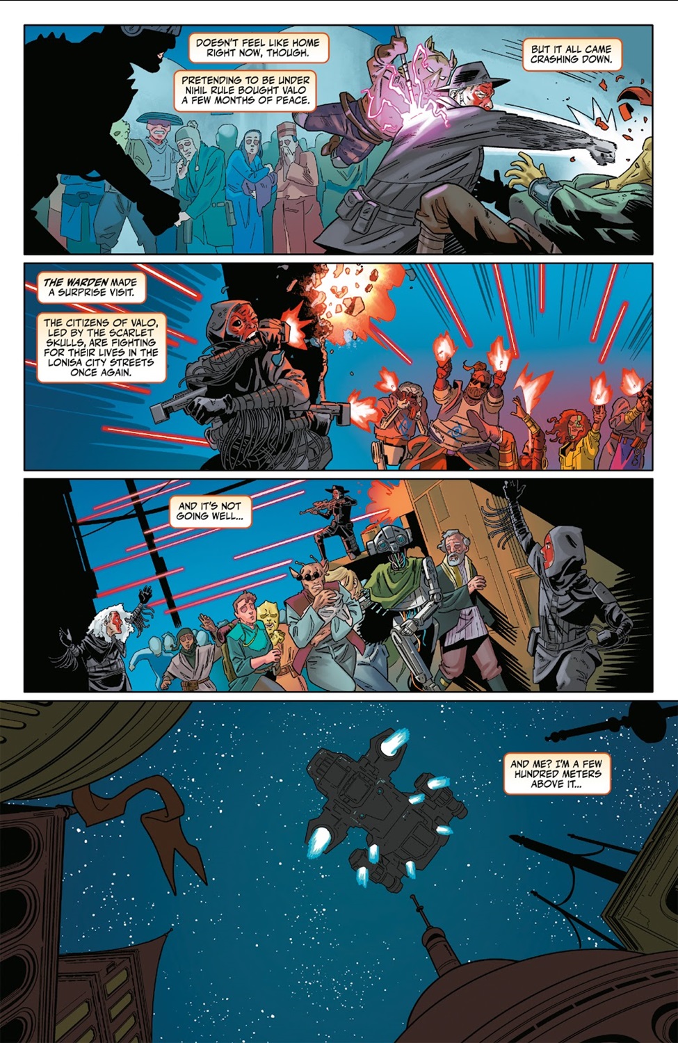 At Crashpoint Tower, poor Padawan Gavi is being held hostage by the menacing being known only as the Warden and is forced to transmit a message of surrender as the Scarlet Skull– once a symbol of hope and resistance for Valo. But when Ram hears this transmission, he comes up with a plan. Meanwhile, Jomaram’s pirate allies Therm Scissorpunch (of the Nephran species) and Drrn (a Muun) attempt to infiltrate the planet’s occupied Jedi Temple. In the air above, Ram is accompanied by his trusty droid V-18 and the Bonbrak mechanics as they hack into the tower’s signal, interrupting the Nihil Broadcast and sending out one of Ram’s own. This inspires some hope around Valo, but soon Therm calls Ram with distressing information– the Warden is about to call for reinforcements. This news forces Jomaram’s hand in destroying Crashpoint Tower once and for all.