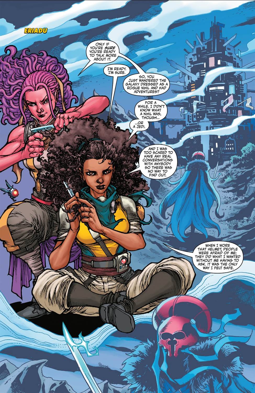 Then Jedi Master Kantam Sy steps in to help Talisola regain some of her lightsaber combat abilities, which seem to come back to her pretty quickly. The back half of this comic is about a hapless maintenance droid called B-333, who gets enlisted by Master Sy to cross the Nihil Stormwall into the Occlusion Zone with a hauler named Argomon on a mission to plant a tracker on a prison ship. There, we meet up with the Umbaran scientist Niv Drendow Apruk (who first appeared in the recent middle-grade novel Star Wars: The High Republic - Escape from Valo, also by Older with writer Alyssa Wong) and his Nameless pet– but before the droid can enact the plan, there’s a surprise appearance by another MIA Jedi character on the final page.