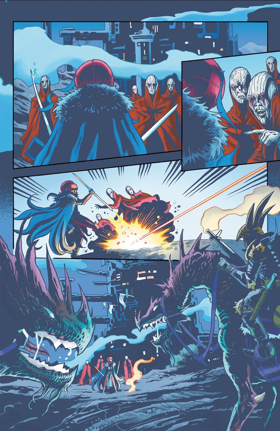 The High Republic Adventures (2023) #3 begins where the previous issue left off, with Jedi Padawan Lula Talisola having reunited with her lost love Zeen Mrala– a Force-sensitive non-Jedi of the Mikkian species. Lula has now abandoned her temporary life as a Nihil warlord and is recounting more of her journey from the fall of Starlight Beacon to the planet Eriadu. We get a few more pages of great mash-up art by illustrators Harvey Tolibao (in the “present" of the story) and Nick Brokenshire (documenting Talisola’s recent past), and then the two young women are also reunited with the galactic superstar Svi’no Atchapat (from writer Daniel José Older’s 2022 young-adult novel Star Wars: The High Republic - Midnight Horizon), while Lula recovers more memories of her conflict with Krix Kamerat prior to Starlight Beacon’s fall.