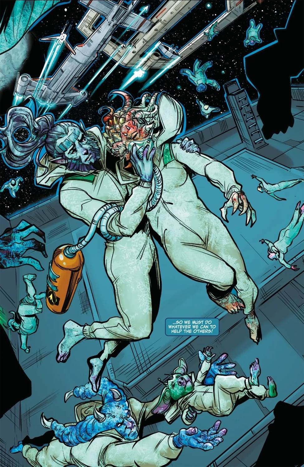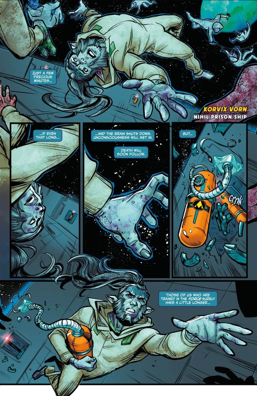 Aboard the ship, we see the Nihil scientist Niv Drendow Apruk scramble to protect the “Nameless" eggs he has left after the two that recently hatched were also thrown into space, while Driggit Parse changes her allegiances once again, abandoning Niv Drendow and following the Warden to safety. Most of the rest of this issue consists of a pretty exciting action sequence that sees the Jedi and their allied Republic forces working in tandem to successfully complete their mission of saving the prisoners, but there’s an added bonus when a splinter strike team (that includes the “chaotic" droid 5A-G3 among its ranks) manages to blow up the Korvix Vorn as well.