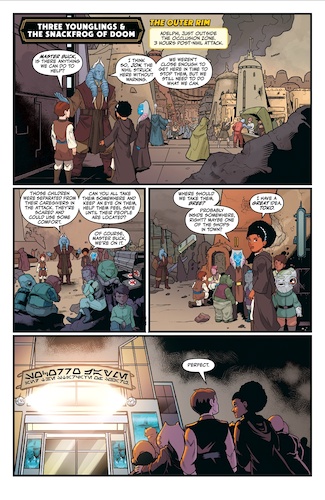 Like the other (Marvel) Star Wars comic book I already reviewed today, The High Republic Adventures 2025 Annual is an anthology made up of multiple stories by different authors, though here the count– and the dollar price– is a bit higher. The first tale, written by Charles Soule and his daughter Rosemary Soule (who previously collaborated on the children’s book Star Wars: The High Republic - Jedi Brave In Every Way), brings us to the Outer Rim planet of Adelphi, which we’ve seen pop up in The Mandalorian as a base for New Republic rangers. Here, the threat of a Nihil attack causes Jedi Master Torban Buck to sequester a group of younglings inside a “holo" theater to protect some local children. There’s a funny gag revealing that the kids are watching a holo that’s obviously inspired by the Indiana Jones movies, though here the character is named Socorro Jayme. The children are safe inside the theater until one of them begins choking on a “snackfrog" (the Star Wars equivalent of movie-theater popcorn, I’m guessing?)-- I also laughed at how the snackfrogs are still alive and clearly unhappy about being eaten, kind of like the paddy frogs in Jabba’s Palace. So the three Jedi younglings– namely Jon, Bree, and Toko (all from the aforementioned book) must team up to help him, each using the skills they’ve acquired in training. It’s a nice story, well-illustrated by Andy Duggan (Star Wars: Hyperspace Stories), but definitely something that would appeal a bit more to younger readers.
