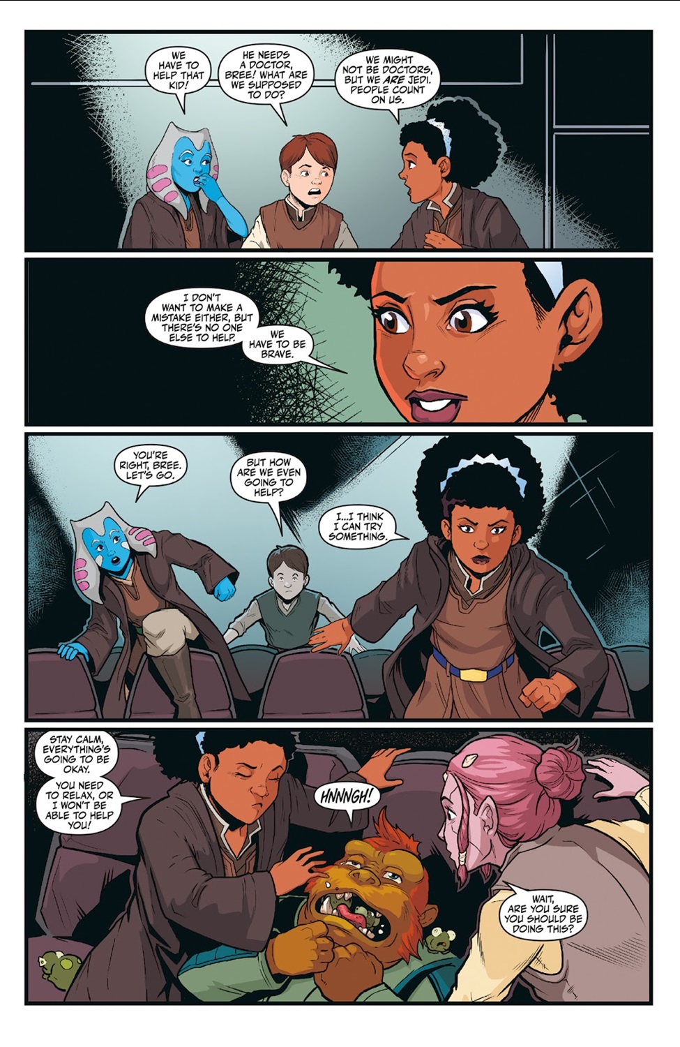 The penultimate story, entitled “Brothers and Sisters," was written by Cavan Scott (of Marvel’s upcoming Star Wars: The High Republic - Fear of the Jedi miniseries) and drawn by Nick Brokenshire (Star Wars: Shadow of Vader’s Castle). It follows up on the events of Scott’s recent audio drama Star Wars: The High Republic - Tempest Breaker, with Nihil mad scientist Baron Boolan in Republic captivity, and a flashback to earlier events that provide an origin story for the so-called “Children of the Storm." A Force-sensitive bounty hunter is hired by a Nazzar named Krrl to rescue his sister from Boolan’s lab. The twist here is that Krrl had actually made a deal with Boolan to swap the hunter for his sister, and hence we get the tale of how H’Tar came to be under the influence of the scientist. Back in his cell on Coruscant, Boolan bides his time knowing that his “Children" are still out there, waiting to strike at the Jedi. This is another good setup for stories to come, and I continue to enjoy collaborations between Scott and Brokenshire.