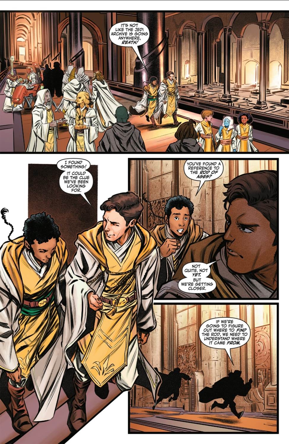 The High Republic Adventures - Echoes of Fear #1 is set during Phase III of Lucasfilm Publishing’s ambitious multi-platform initiative Star Wars: The High Republic, with Nihil Leader Marchion Ro having divided the galaxy via his Stormwall. And now, in the Jedi Temple on Coruscant Jedi Knight Reath Silas and Padawan Amadeo Azzazzo investigate the existence of the long-thought-mythical Force artifacts known as the Echo Stones, in the hopes that information about them will led to the Rod of Ages, which have the ability to control the Force-eating creatures called the Nameless. So Reath and Amadeo race to the Jedi Archives, breezing past Master Vernestra Rwoh on their way. Then Silas shows Azzazzo a holocron containing a story from an “old Jedi explorer" named Joria Skarl, who specialized in creating a record of myths and legends– a reference to one of writer George Mann’s other Star Wars works. From that point on, this issue is mostly a depiction of the tale of Darth Ravi the Bold, who was first mentioned in Claudia Gray’s Star Wars: The High Republic Adventures - Quest of the Jedi last year.