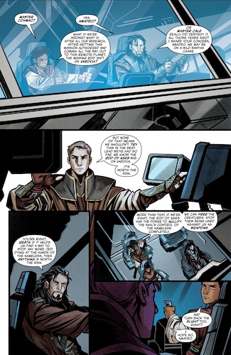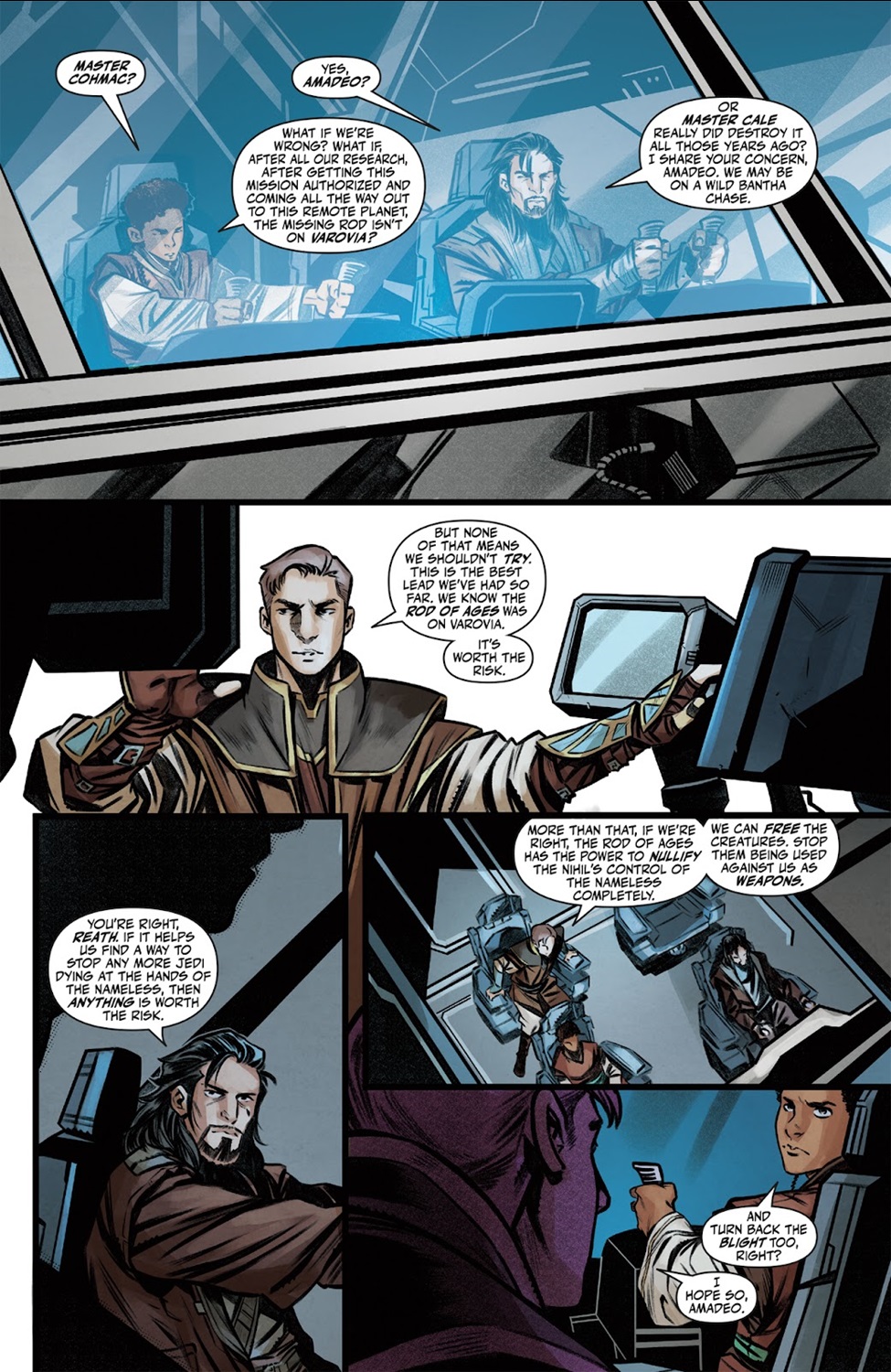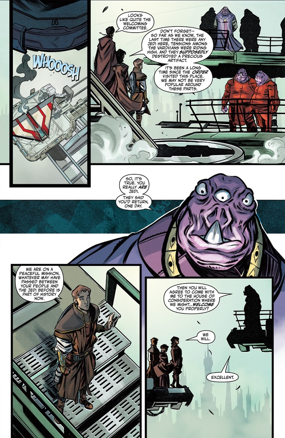 The High Republic Adventures - Echoes of Fear #4 begins with Jedi Knight Reath Silas and Padawan Amadeo Azzazzo on their way to the planet Varovia along with former Jedi Master Cohmac Vitus. When they arrive, they are greeted by surprisingly friendly members of the Varovian species, considering what happened between the warring nations and the Jedi the last time members of the Order visited. Our three protagonists manage to convince a leader named Ambassador Kaarok to let them literally dig up the past by returning to the site that was once home to the temple holding the Rod of Ages, but when they get there they find that the temple has been decimated to the point of being indistinguishable from the terrain surrounding it.