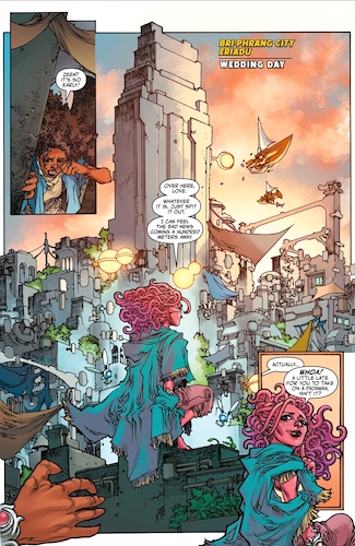 We’ve entered an unfortunate period where The Walt Disney Company seems to be backpedaling on its commitment to diversity and representation in its entertainment (with the recent shelving of an episode of Marvel’s Moon Girl and Devil Dinosaur and the reveal that Pixar’s Win Or Lose is being re-edited to remove references to a character’s transgender status) it was kind of relief to pick up a Star Wars comic book with a lesbian couple getting married on its cover today. With that observation out of the way, let’s dive into what makes this Wedding Spectacular special outside of its inclusion. The entirety of the story takes place in Bri-Phrang City on the planet Eriadu, which currently lies in the Occlusion Zone behind the Nihil Stormwall. As former Jedi Lula Talisola and the Force-sensitive non-Jedi Zeen Mrala prepare for their big day, Padawan Gavi Takitaken (from author Daniel Jose Older’s middle-grade novel Star Wars: The High Republic - Escape from Valo) shows up with some quite unfortunate news: the Nihil are planning an imminent attack on the planet.