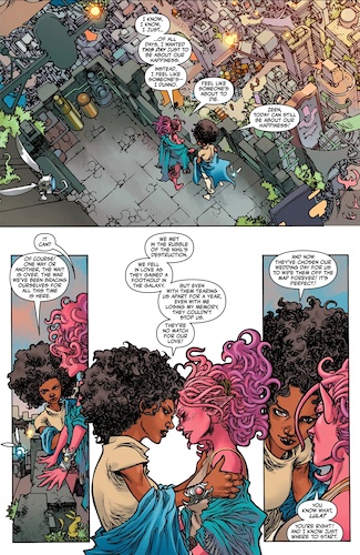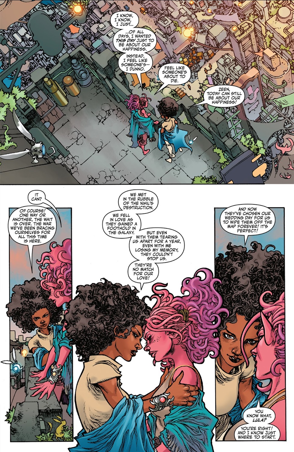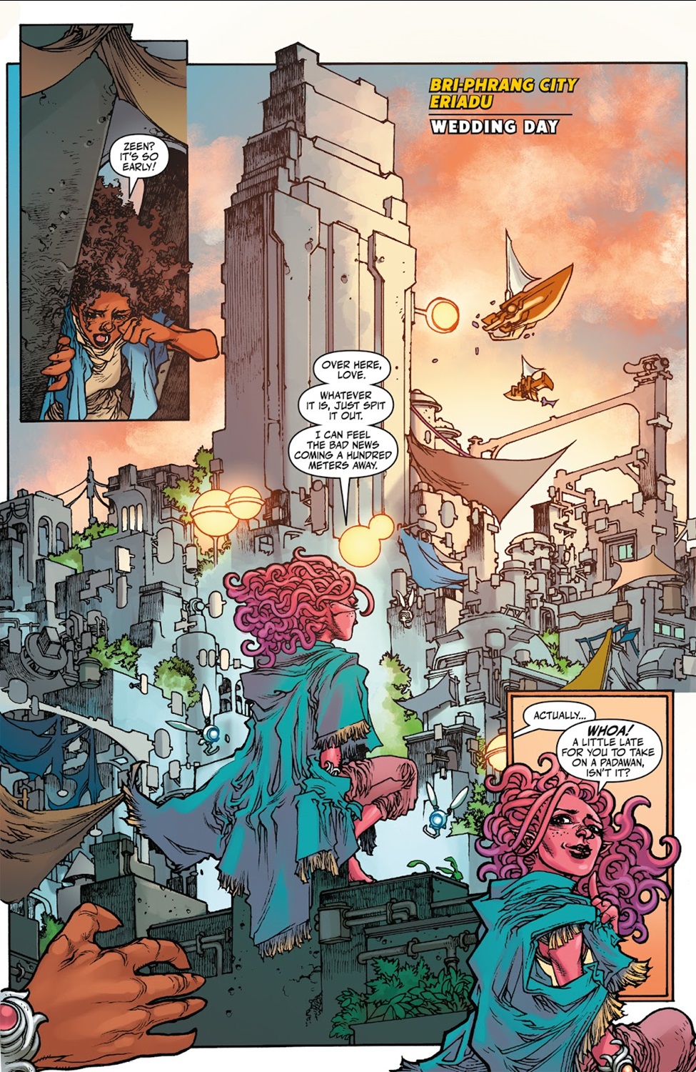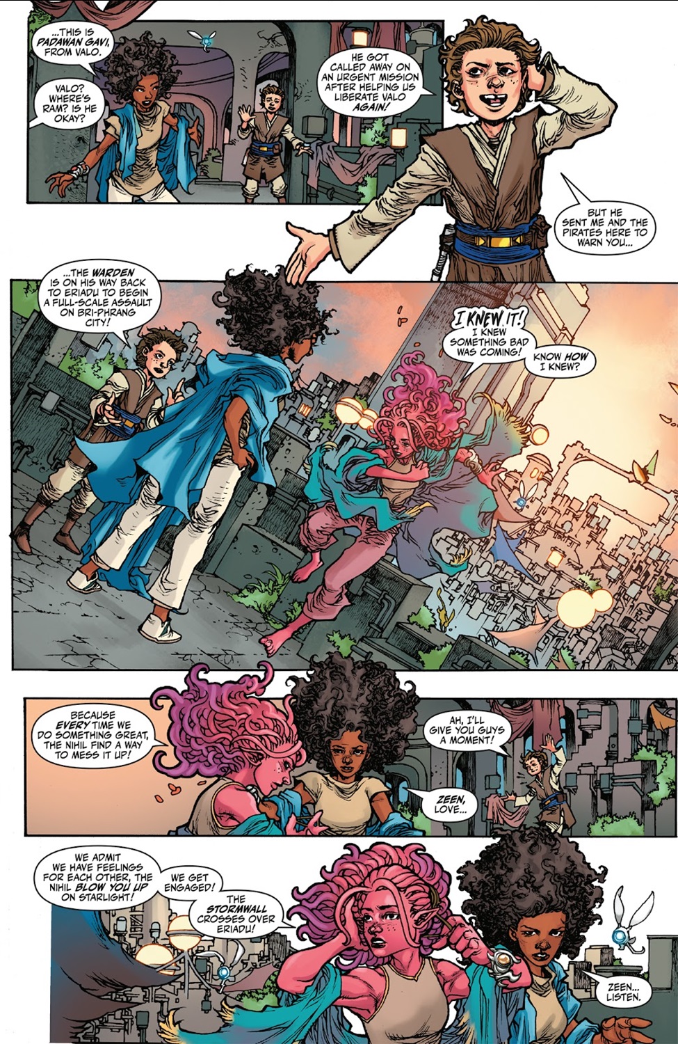 We’ve entered an unfortunate period where The Walt Disney Company seems to be backpedaling on its commitment to diversity and representation in its entertainment (with the recent shelving of an episode of Marvel’s Moon Girl and Devil Dinosaur and the reveal that Pixar’s Win Or Lose is being re-edited to remove references to a character’s transgender status) it was kind of relief to pick up a Star Wars comic book with a lesbian couple getting married on its cover today. With that observation out of the way, let’s dive into what makes this Wedding Spectacular special outside of its inclusion. The entirety of the story takes place in Bri-Phrang City on the planet Eriadu, which currently lies in the Occlusion Zone behind the Nihil Stormwall. As former Jedi Lula Talisola and the Force-sensitive non-Jedi Zeen Mrala prepare for their big day, Padawan Gavi Takitaken (from author Daniel Jose Older’s middle-grade novel Star Wars: The High Republic - Escape from Valo) shows up with some quite unfortunate news: the Nihil are planning an imminent attack on the planet.