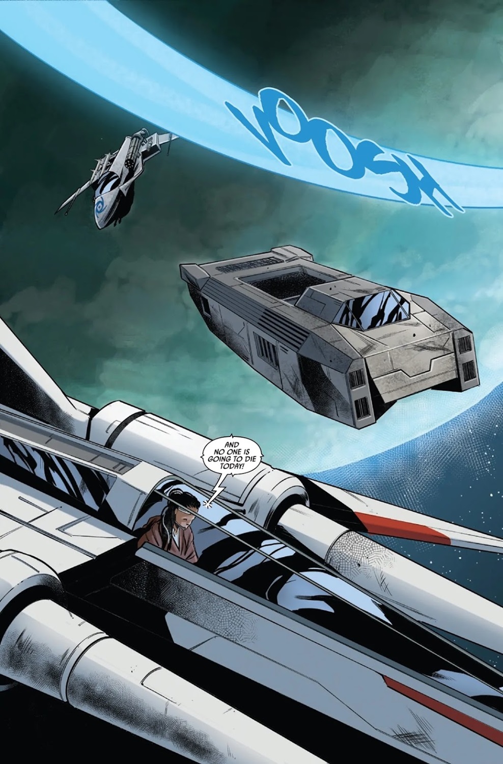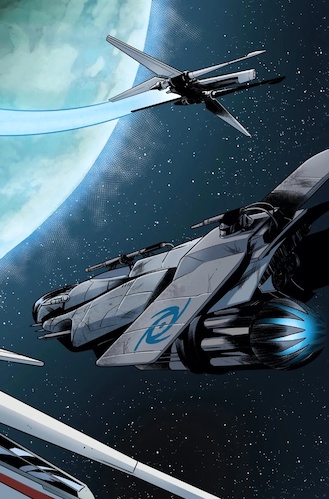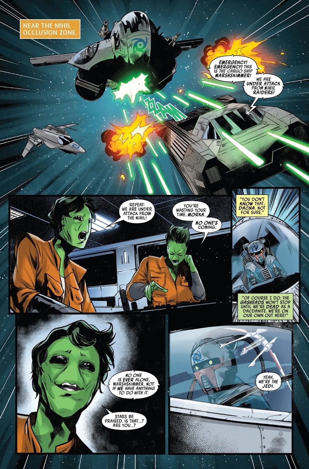 The High Republic - Fear of the Jedi #1 begins with Jedi Master Keeve Trennis and her own former master Sskeer patrolling the border of the Occlusion Zone, where they help the innocent pilots of a cargo ship escape two Nihil raiders. During the skirmish, Keeve accidentally destroys one of the Nihil ships, while the other one escapes back across the Stormwall. Then writer Cavan Scott (from Marvel’s previous flagship Star Wars: The High Republic title) and artist Marika Cresta (Star Wars: Doctor Aphra) cut to Nihil-occupied Naboo, where Lourna Dee and her newly formed bounty hunter crew are searching for those who survived Baron Boolan’s experiments. While they’re sneaking around the capital city of Theed, they’re jumped by some Nihil hoodlums, but soon they find themselves being assisted in the conflict by two Jedi– Master Kelnacca (who dies in Star Wars: The Acolyte a hundred years later on in the timeline) and the Wookiee’s Padawan learner Yarzion Vell (introduced in Scott’s Star Wars: The Acolyte - Kelnacca one-shot comic last year).