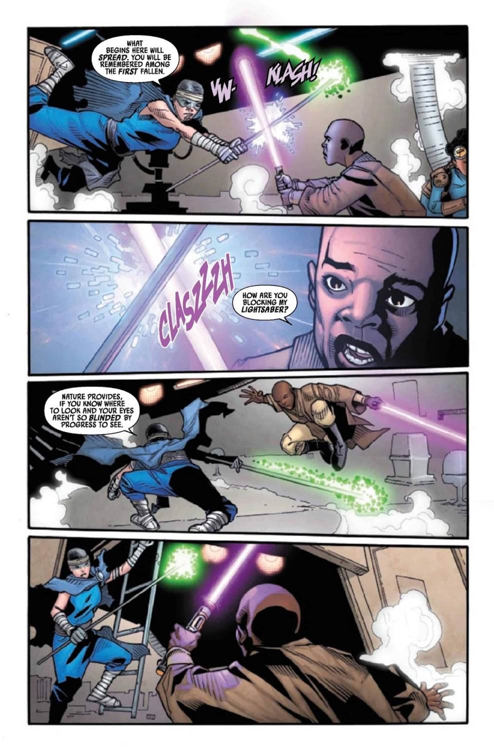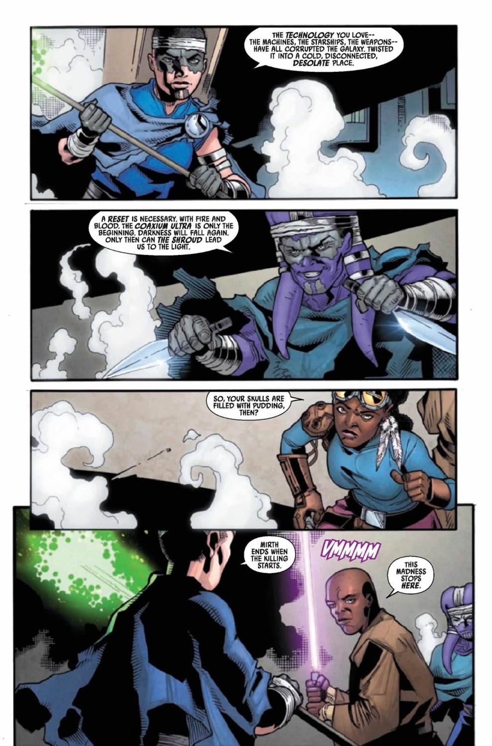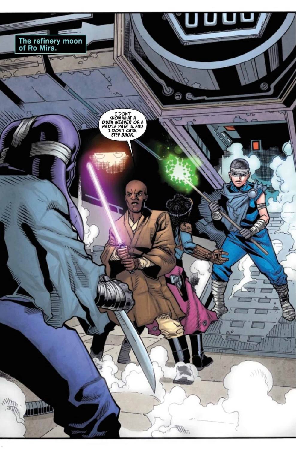 Mace Windu #4 begins immediately where the previous issue left off, with a great splash page of the titular Jedi Master character responding to the statement made in the final panel of the previous issue (I’m sure this will play wonderfully in the collected trade-paperback version of this miniseries). Mace says he has no idea what a “Dusk Weaver" or the “Had’le Path" are, simultaneously recapping the two new terms we learned in last month’s cliffhanger ending and issuing a defiant “I don’t care" statement from our favorite badass Jedi, as he and pirate Azita Cruuz are surrounded by two weapon-wielding cultists. These attackers spell out their demands, which basically involve the abandonment of all technology (I don’t think this is something I’ve seen in Star Wars before, which is cool) and naturally a fight breaks out, with one of the combatants using an electrostaff that can somehow block a lightsaber, to Mace Windu’s astonishment– I’m guessing it’s made out of beskar, but that isn’t confirmed here.