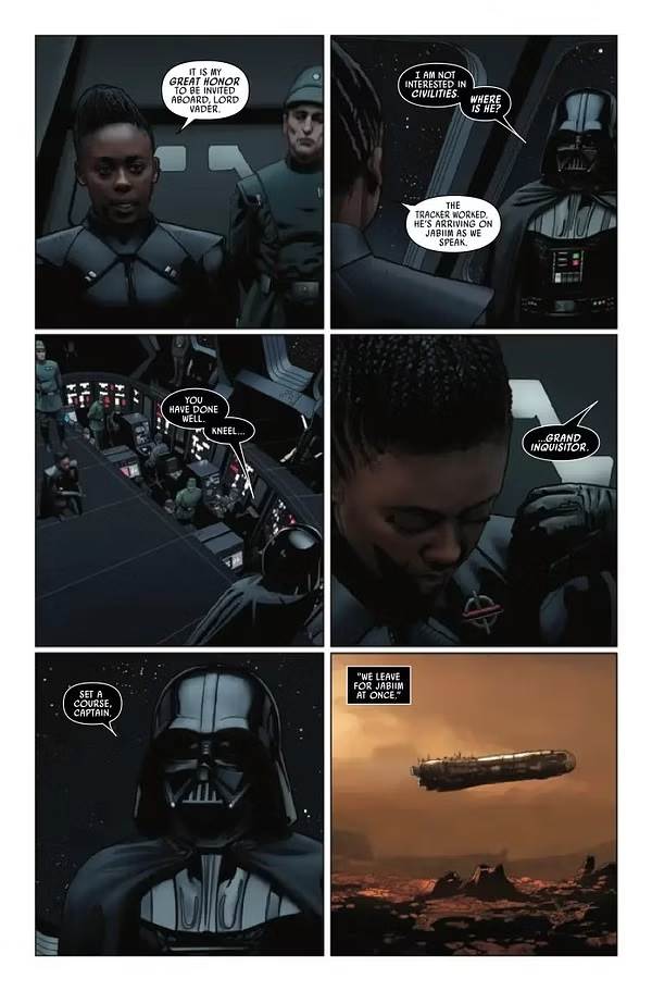 But I’ve said all that before, so let’s talk about what’s actually good in this issue– here’s a hint: it all comes directly from the penultimate episode of Star Wars: Obi-Wan Kenobi. This is the one in which the title character and his temporary ward Princess Leia Organa have sought shelter in a bunker run by “The Path"-- an Underground Railroad of sorts for Jedi and other Force-users after the events of Order 66 and the rise of the Empire. We get some fun flashbacks to a training session between Obi-Wan and his then-Padawan learner during the Clone Wars era, which are partnered with a plot by Darth Vader in the “present" to infiltrate the Path holdout on the planet Jabiim and capture his old Master. In the meantime, the Inquisitor called Reva is cooking up her own plans involving Obi-Wan and Vader, and here we learn more about her past as a Youngling in the Jedi Temple during the Purge. There are some dumb moments– the whole thing with young Leia in the vents doesn’t play any less groan-worthy on the comics page than it did on TV– but by and large the story works.