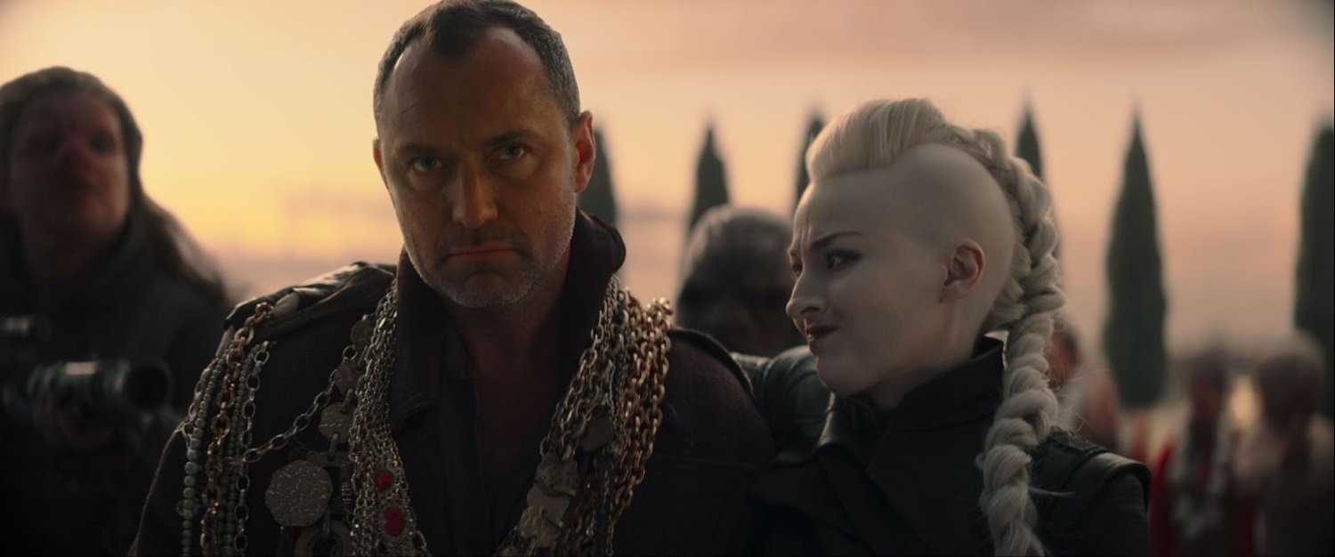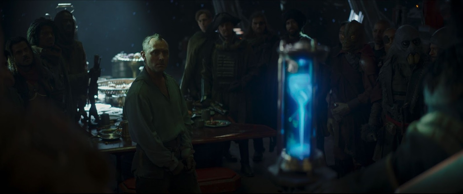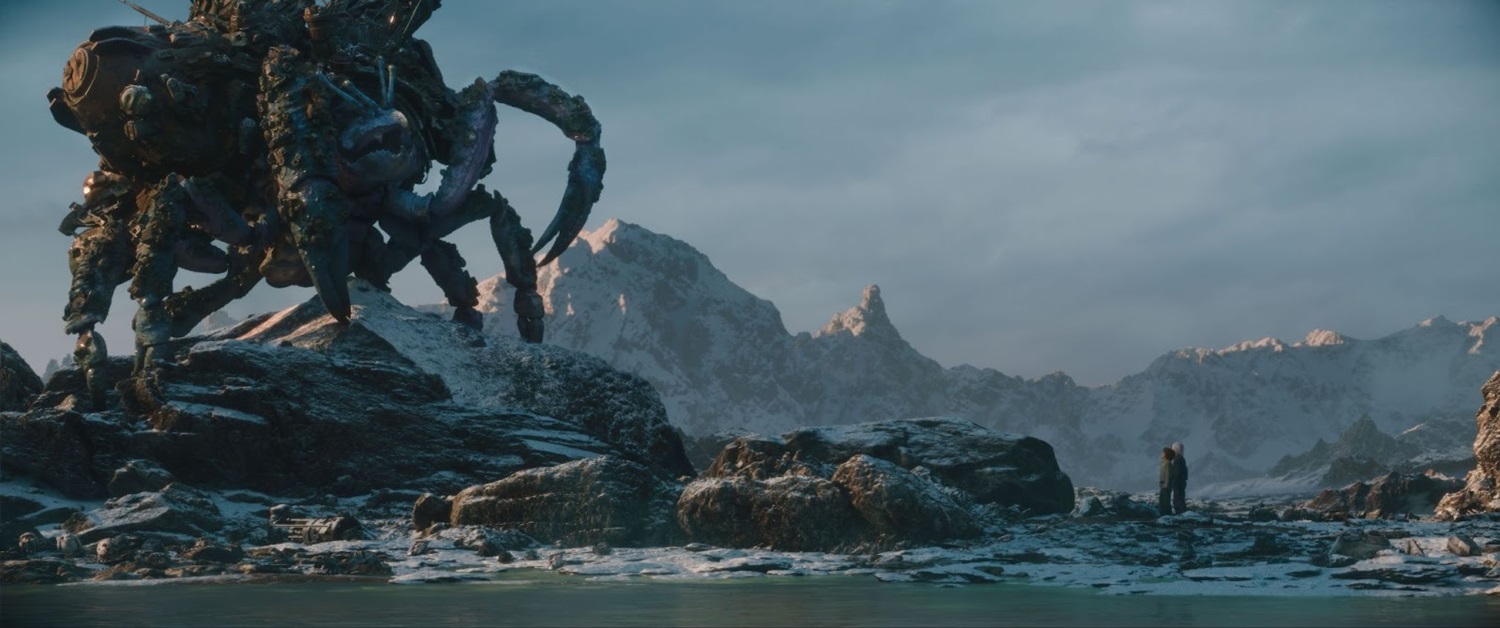 Meanwhile, Jod (Jude Law)-- AKA the Mad Captain Silvo– climbs out of the lair through a manhole leading to the hotel’s landing pad, only to find Gunter (Jaleel White) and the other pirates waiting for him. They zap SM-33 (Nick Frost) with an ion blast, incapacitating the droid once again, and take them both hostage aboard their ships, leaving the Onyx Cinder and the kids behind. Speaking of which, the younglings split up, with Fern taking poor Neel (Robert Timothy Smith) along on her arduous climb and KB joining Wim to follow the crabs to a big garbage pile where the resort evidently dumps its trash. There they encounter the enormous queen crab– skillfully executed via stop-motion animation by Tippett Studio– while Neel struggles to keep up with Fern’s “spider legs."