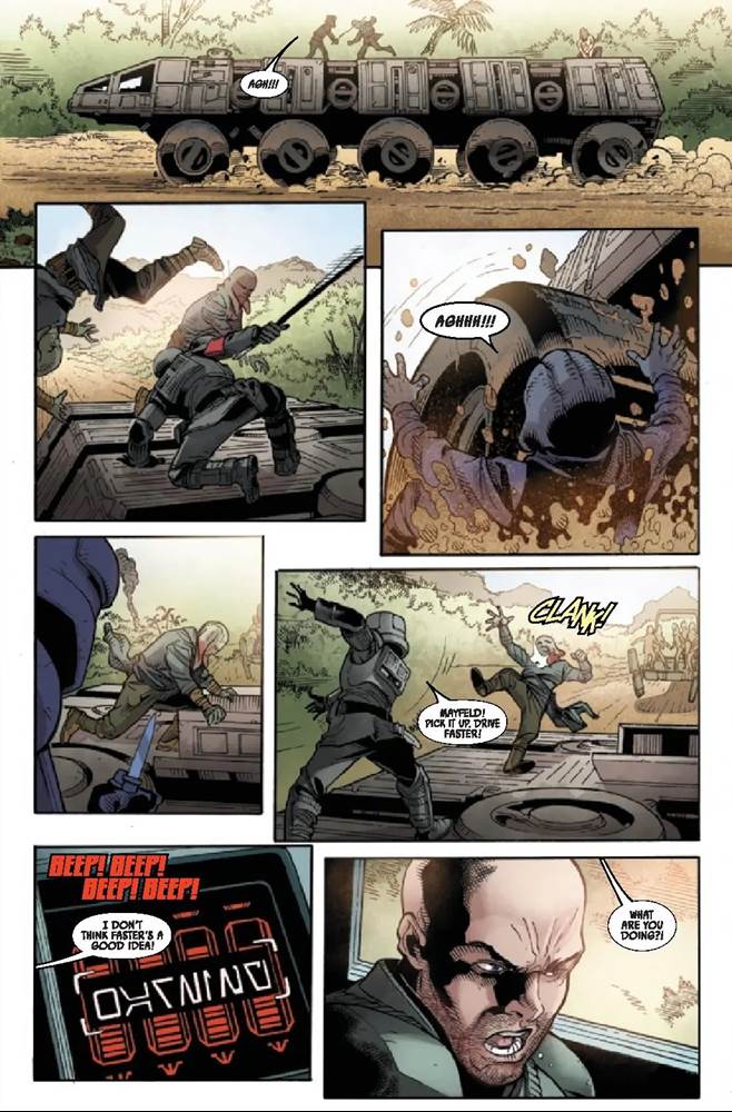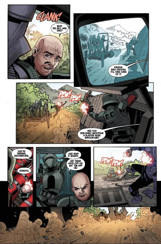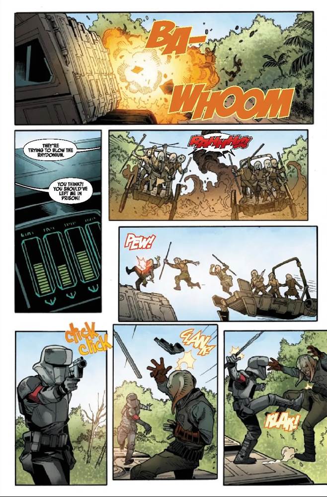 I’ve had minor quibbles with these comic adaptations before, but this chapter doesn’t hit any of those stumbling blocks, instead finding the perfect pacing as the familiar narrative plays out through sequential art. Obviously the dialogue here– like in past issues– is almost entirely lifted from the episode in question, but the way in which it’s presented almost perfectly captures the tone of “The Believer," right down to actor/comedian Bill Burr’s attitude– I can almost hear his unmistakable Bostonian accent coming out of the drawings. The action is well-choreographed as well, with a number of pages dedicated to the chase sequence that sees Mayfeld and Din Djarin racing through the jungle of the planet Morak in an Imperial tank carrying an explosive fuel called Rhydonium. And while the process of getting it to the local mining facility doesn’t quite make sense– why not just fly it there?-- that comes directly from Jon Favreau’s script, so Barnes can hardly be blamed.