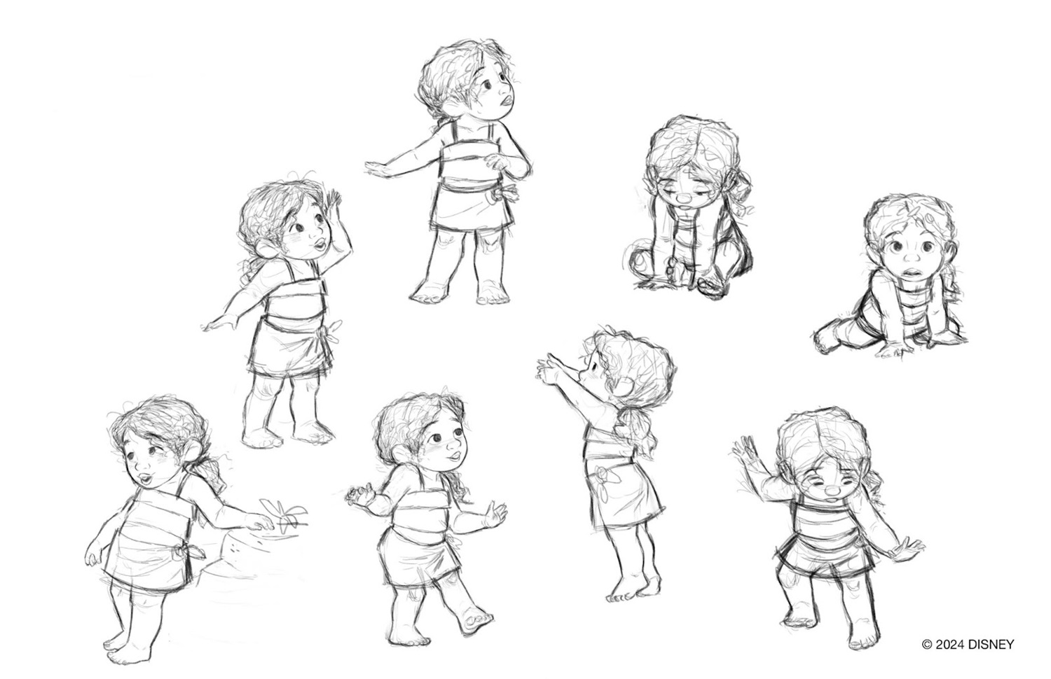 “This is definitely a favorite character of ours," character art director Danny Arriaga said of Moana’s little sister Simea. “I started sketching her, keeping her age and personality in mind. I wanted to make her unique, so I focused on little things that bring character to life. I don’t often see children’s hair animated realistically - it’s always perfect, slicked back, and tidy, which isn’t realistic. So, Simea’s hair looks like it’s fallen out of a ponytail, with a little mess and strands falling into her face. She also has a bit of a buck-toothed smile, which felt perfect for her." Danny also referenced toddler Moana from the first film while also blending physical characteristics from both of her parents.