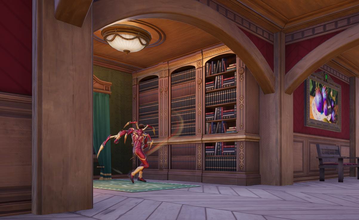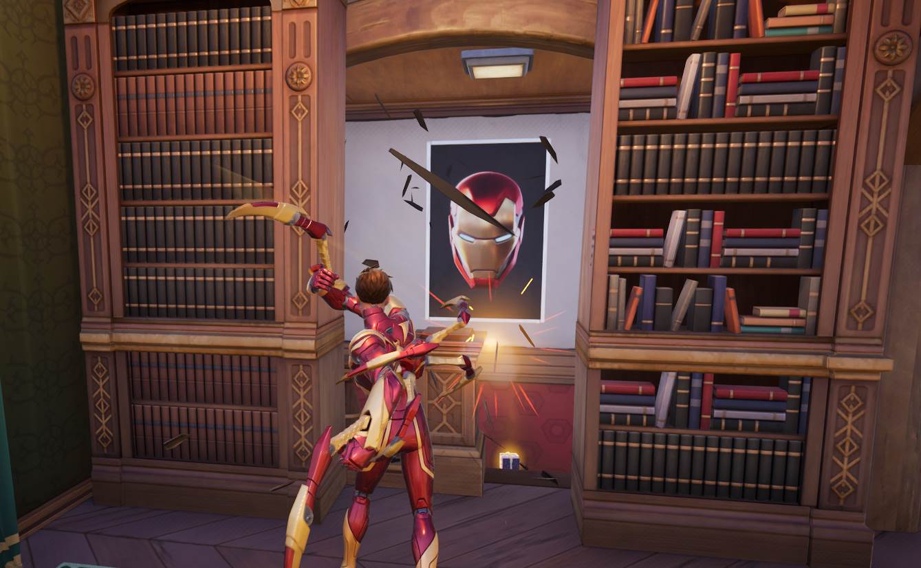 First thing we have to do is head to the Northwest portion of Doomstadt. Enter the house in the upper corner, which features a bucket above the door painted like Iron Man’s helmet. Once inside, look around to find three bookshelves on the ground floor. Break those to unveil a staircase down into the Tony Stark Fan Club headquarters.
