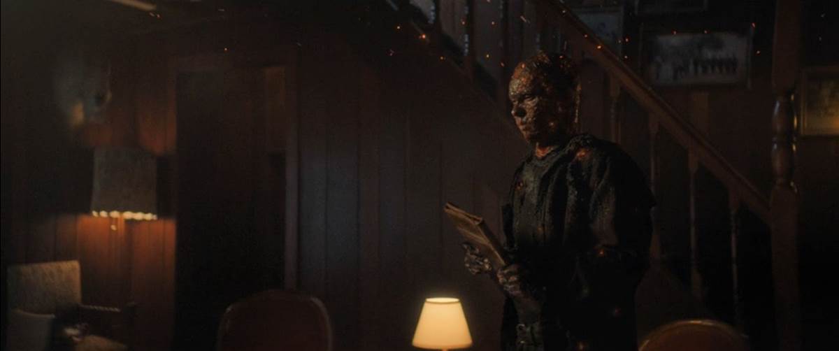 “Whose there?", Harold yells into the night after answering the door. We see Ben sneak inside, head to the basement, grab Slappy, and begin to put the doll in its trunk. “Goodbye, little idiot," Ben says to the dummy, who comes to life. “Goodbye to you, little idiot," Slappy quips back. The power goes out, and a chandelier falls. Upstairs, Harold is scared as he lights a candle. The cuckoo clock goes off, and Harold slips into the basement, not seeing Ben hiding in the shadows holding Slappy’s case. Sarah has a last-minute change of heart, and she and the girls rush to the basement door, which seems to be locked now. They bang on it, trying to get Harold to open up and come with them. But then the fire alarm goes off and smoke begins to fill the air, so they rush outside.