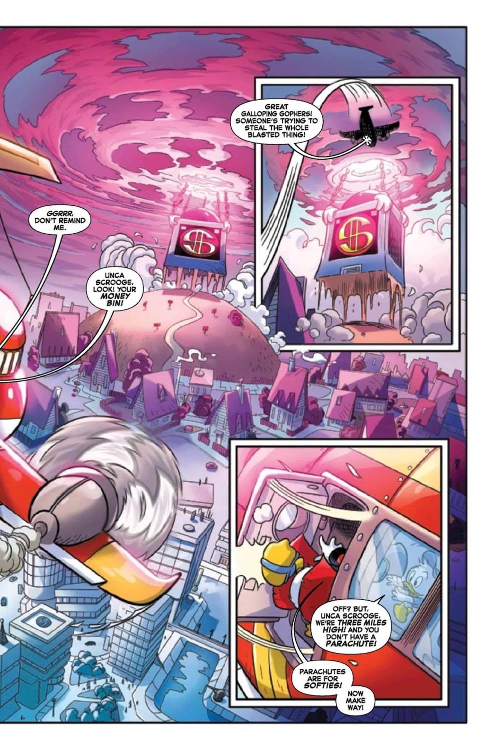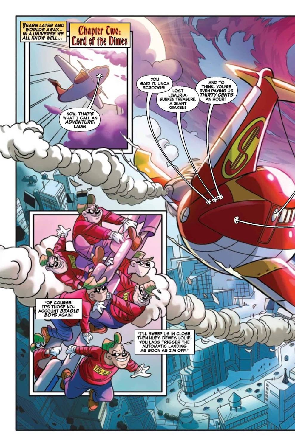 Then Aaron cuts to “our" Scrooge– assumedly the one from the Barks / Don Rosa comics timeline as he returns home from another adventure with his nephews. They come upon the Beagle Boys lifting Scrooge’s money bin up into the air and through a portal into the “All-Scrooge’s" (think the Prime Kang or the “Rickest Rick") dreary universe. So our Scrooge consults with Gyro Gearloose, learns that his number-one dime (or at least what it represented) was the key to traveling the multiverse– and then spends weeks collects up a super-team of his own, made up of a number of alternate Scrooges, to invade the All-Scrooge’s (also known in his universe as the “Lord of Dimes") All-Bin, which contains– you guessed it– all the other money bins inside of it. From there we see a confrontation play out between this heroic Scrooge super-team and the All-Scrooge, and without spoiling too much I can say the conflict ends pretty much how you might expect, but it’s an entertaining ride along the way.