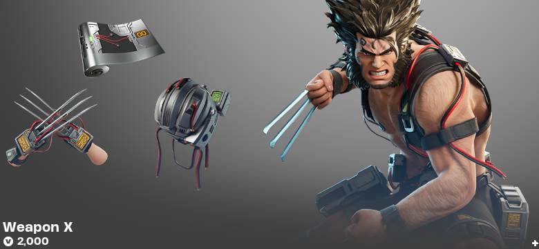 - The adamantium-bonded Wolverine skin showcases the X-Men character hooked up to his high-tech equipment. With a new Weapon X Claws pickaxe, Experiment X Gear back bling and a matching X-Tracker weapon skin, fans of the Marvel character can drop from the battle bus in style.