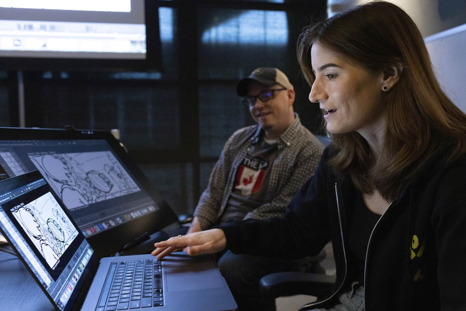 I also got to see Becca McVeigh in action during a story pitch of a key scene near the beginning of the film. A story artist on the film, McVeigh translates written script pages into visuals by drawing storyboards. Once she’s drawn a sequence, she pitches that work to the director and makes adjustments based on their feedback. She started at Pixar Animation Studios as a story intern in 2017 before being hired on full time as a story artist in April of 2021.