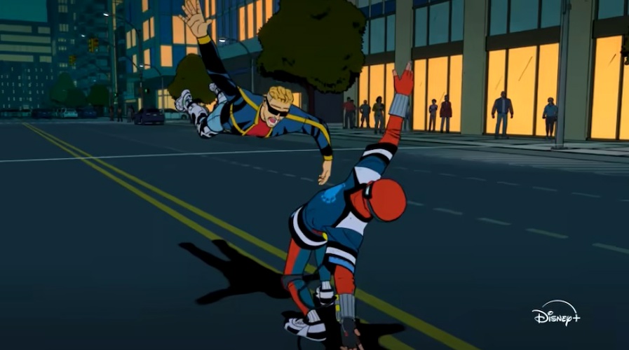 We then jump to a jewelry store where the mystery couple, now wearing some interesting tech, begins to rob the place. They easily take out the security guard with this tech. As we learn later from the credits, this couple is James Sanders and Maria Vasquez, better known as Speed Demon and Tarantula, respectively. While Speed Demon was a villain in the comics, Vasquez’s Tarantula was a hero, so this is an interesting switch for her.