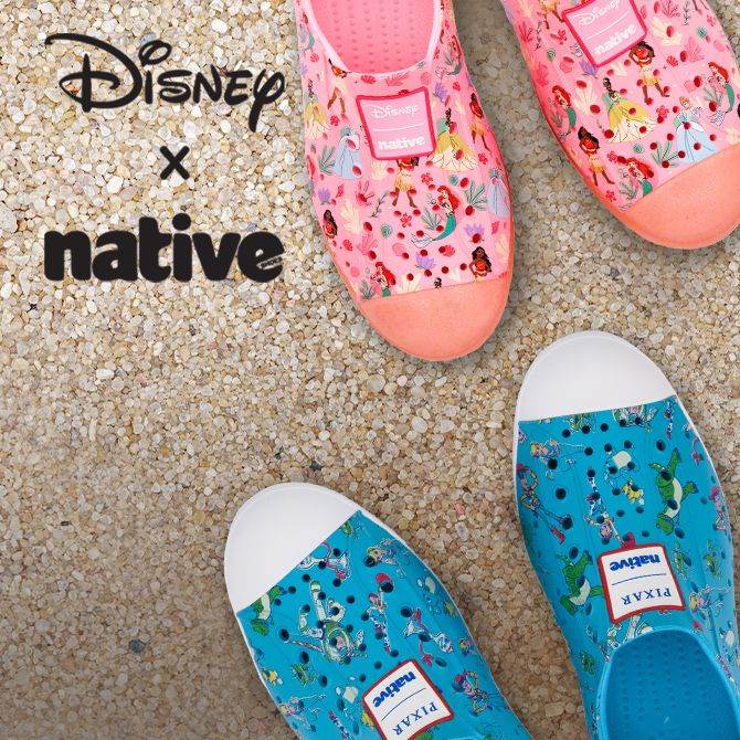 - For a few years now, Disney’s and Native have collaborated on fun and fancy footwear featuring popular characters and stories that fans adore. Today, a new wave of kids shoes was introduced at Disney Store with designs starring Princesses and Toy Story pals.