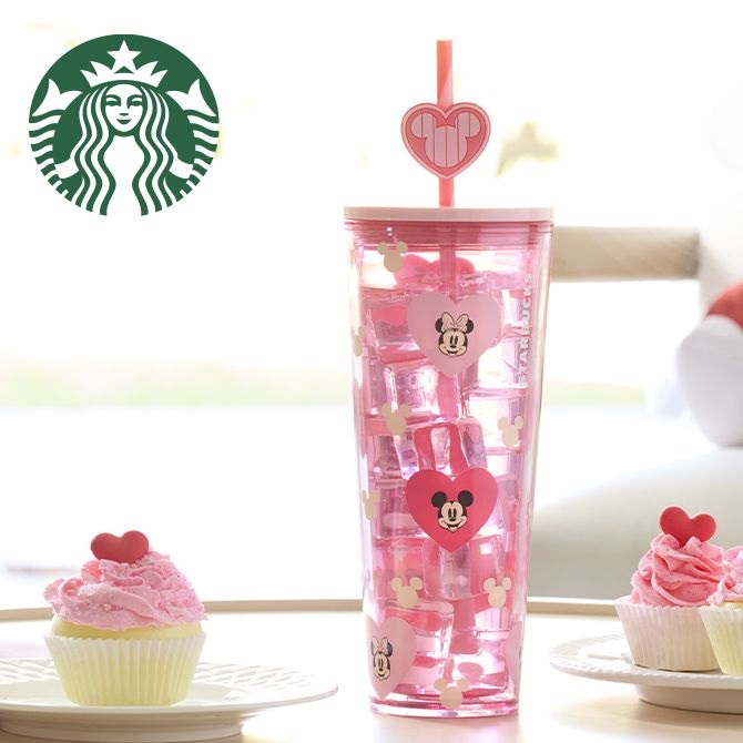 - Disney Store and Starbucks are here to help you along with the latest must have tumbler to roll in in for the season. Guests will be dazzled by the pretty transparent pink cup that comes with a twist-on lid and matching reusable straw complete with a heart icon accessory.