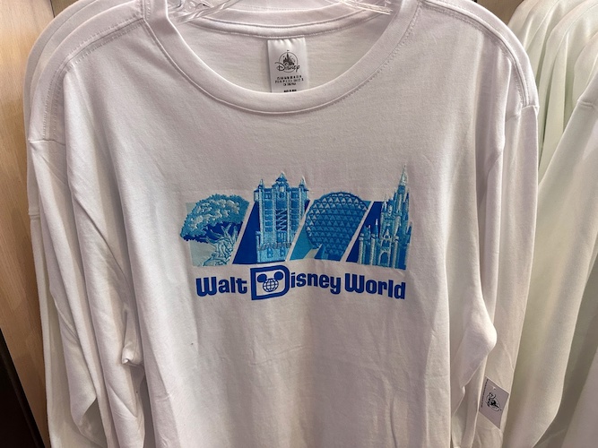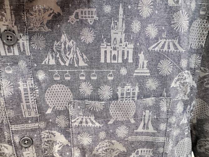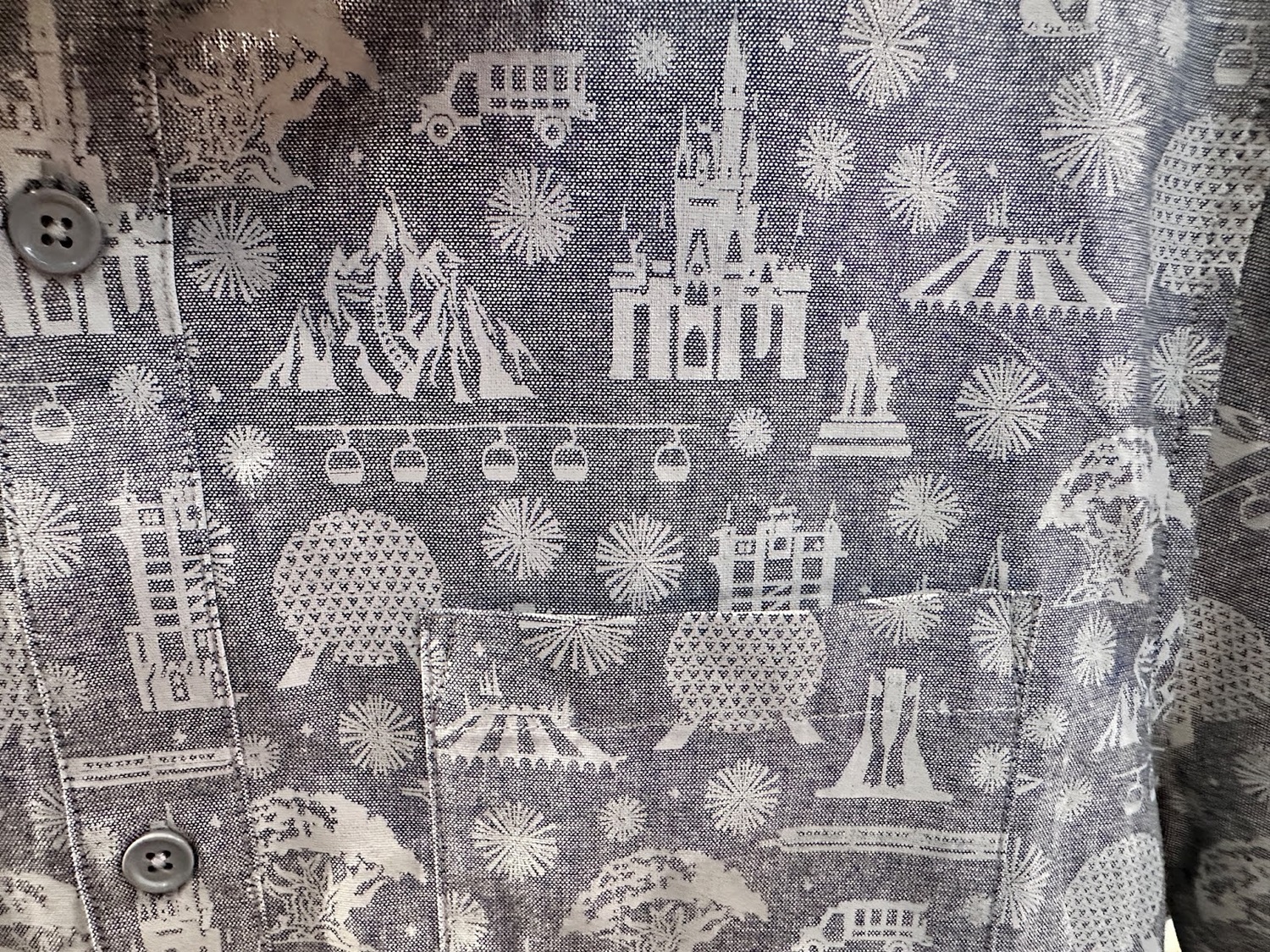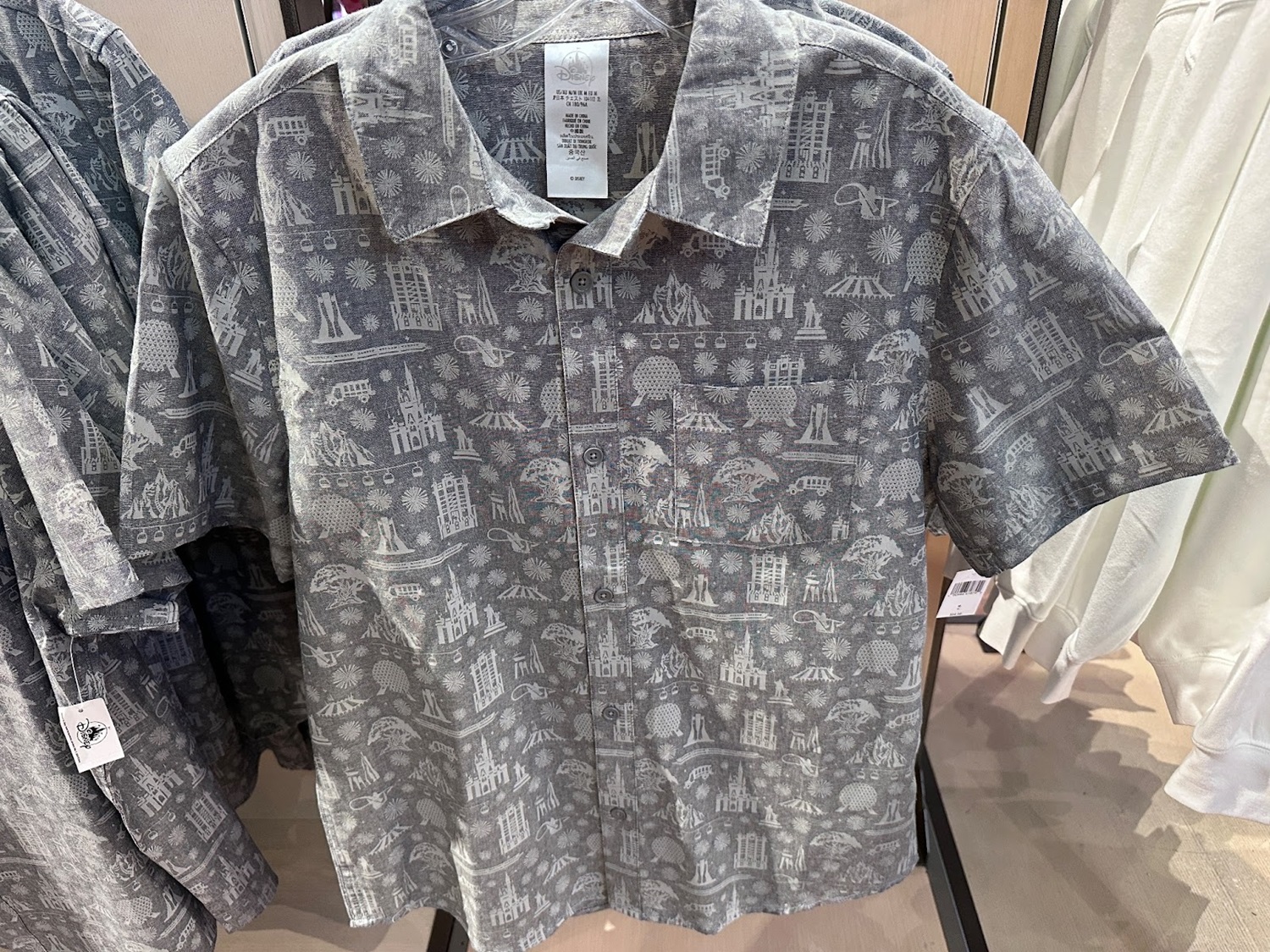 - Lastly, there’s a wonderful, gray button-up shirt that features the four main park icons, alongside a number of other iconic elements from throughout Walt Disney World.