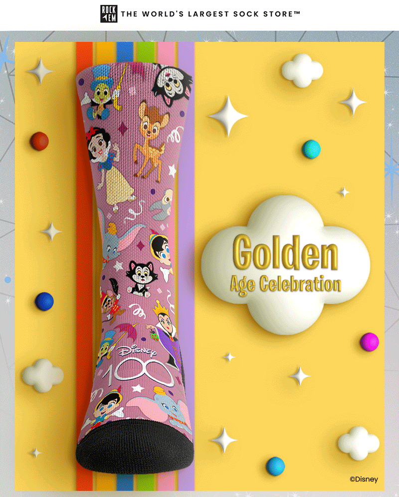 In honor of Disney100, Rock ‘Em Socks has been unveiling new designs and this month they’re pulling out all of the stops with seven exclusive patterns centered around the bronze, silver, golden, and renaissance ages of Disney animation.