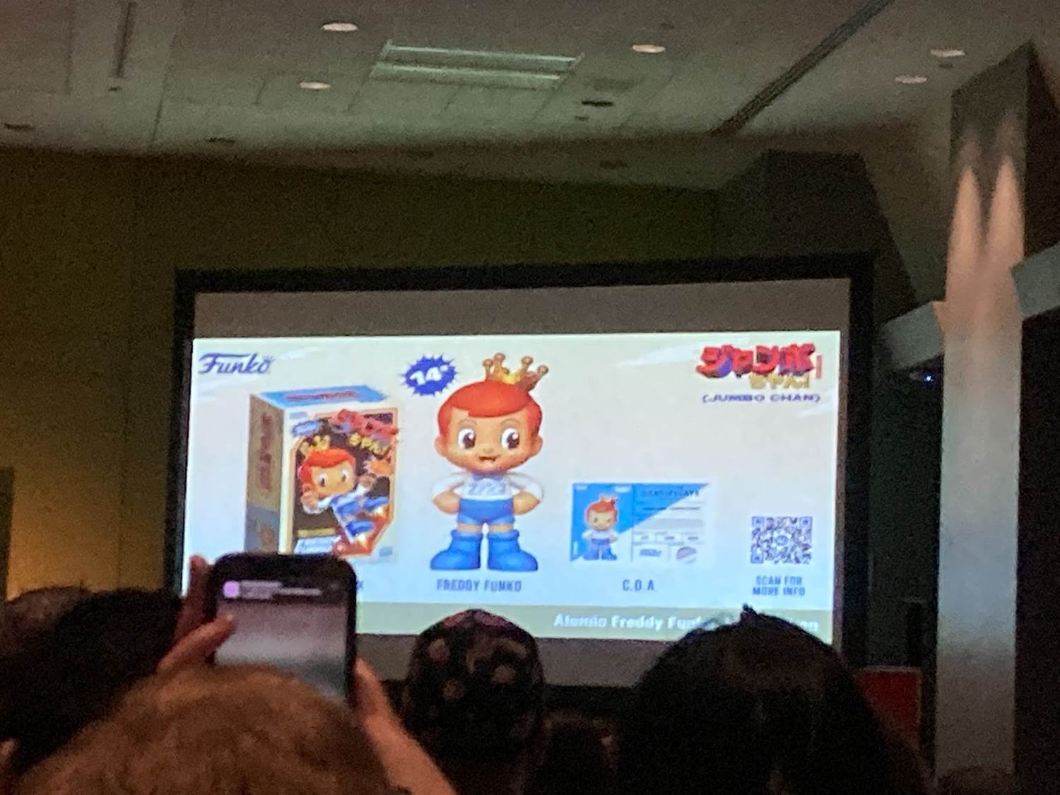 Previously, Becker had teased a big announcement for the panel. He even went as far to say that this project was one of his all time favorites. So what was it? The reveal of a Freddy Jumbo Chan. This 14" figure takes inspiration from retro Japanese toys (hence all of the hiragana and katana on the box), with Freddy assuming the role of an Astro Boy-esque figure. What’s more, Becker promised that a Franny Jumbo Chan would follow.