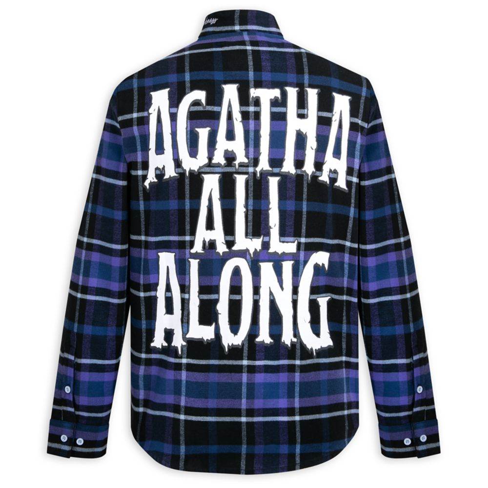 - Fans will love the purple and black flannel button down and the bold white lettering on the back of the shirt that reads “Agatha All Along;" and her signature emblem embroidered on the front pocket.