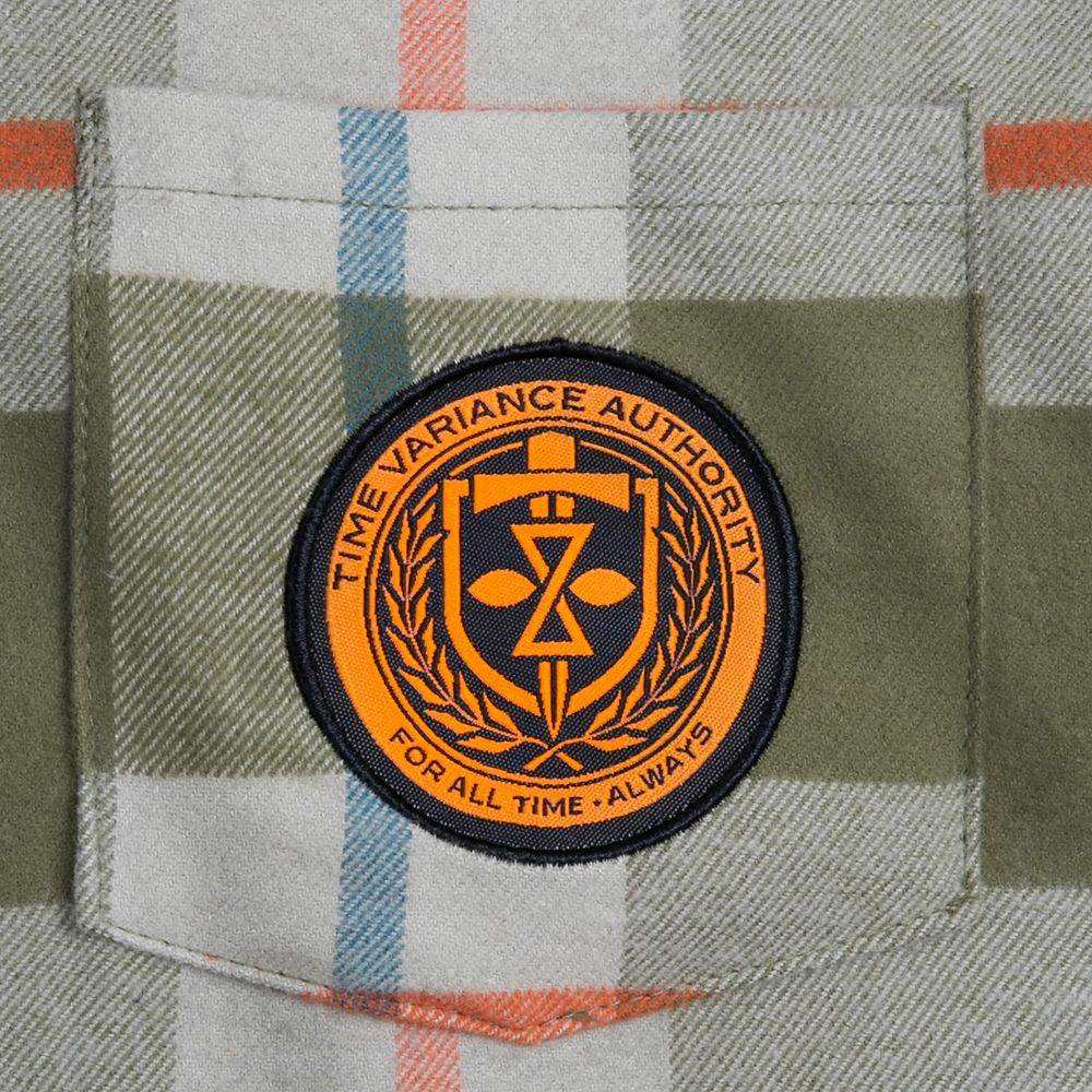 - Loki steps into the spotlight on an olive green and cream flannel accented with blue and orange stripes. “Variant" is printed in large orange letters across the shoulders and the TVA (Time Variance Authority) logo is featured on the front chest pocket.