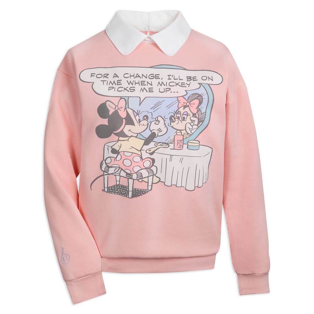 - Fans can stay cozy in the standard sweatshirt that has an image of Minnie at her vanity getting ready for a date with Mickey and pondering how she’ll “be on time" for once.