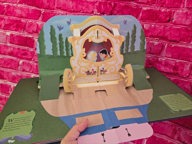 The storybook’s opening pages reveal Cinderella’s beautiful home where she cooked and cleaned for her cruel stepmother and two stepsisters. Exploring the pull tabs throughout her home reveals the moment invitations for the Ball arrive, Cinderella’s mice friends give her a beautiful gown, and when her stepsister rip it to shreds in a jealous rage. Other pop-up scenes include Cinderella's magical gown transformation, her pumpkin coach, the reception at the Palace and of course the finale moments trying on the glass slipper and wedding coach ride.