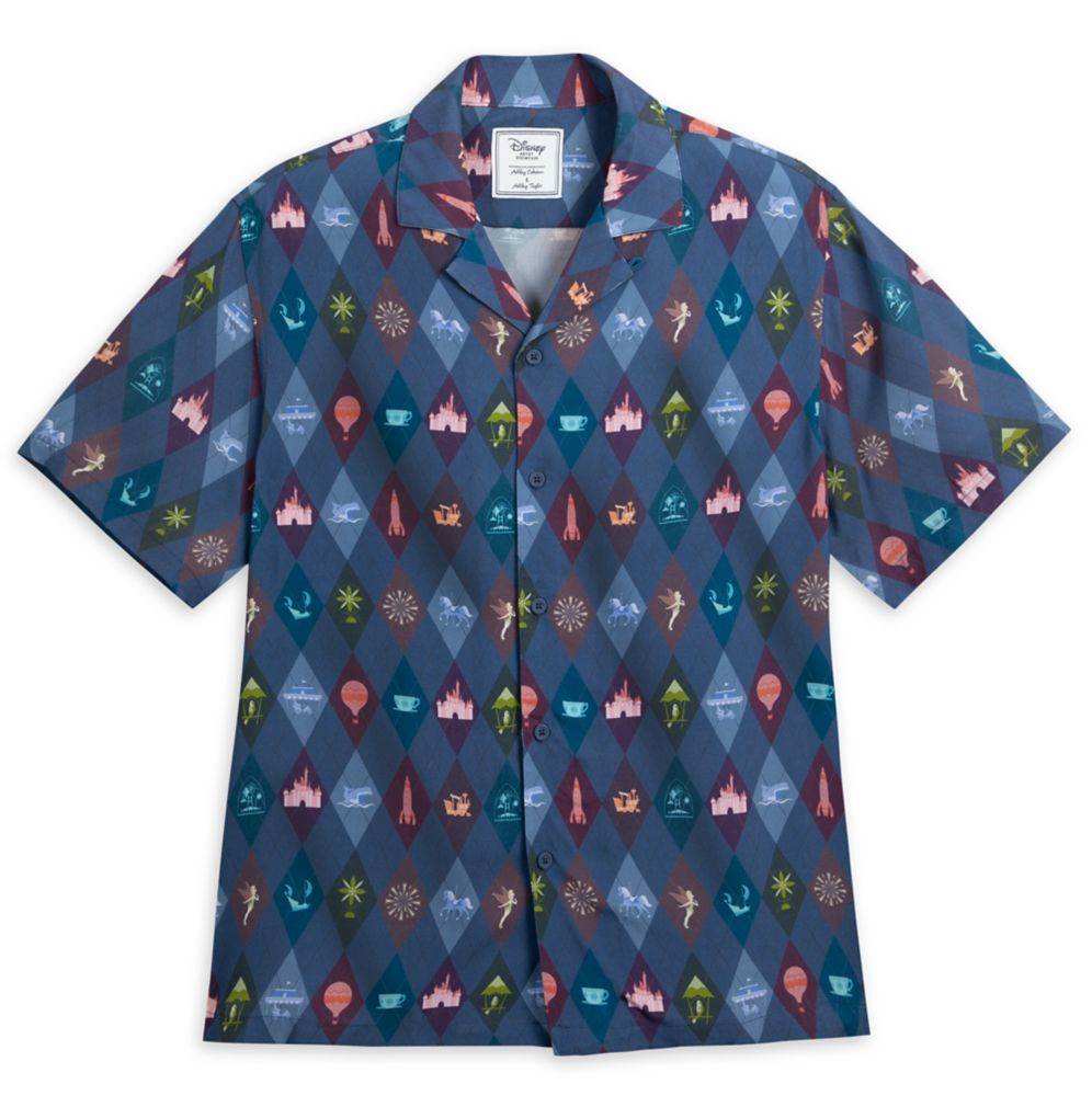 - The shirt is dark blue and has a very light argyle pattern blending in among the icons; while the tea cup features Sleeping Beauty castle and icons surround the saucer. Adding to the fun, a Tinker Bell tea infuser provides an extra touch of magic.