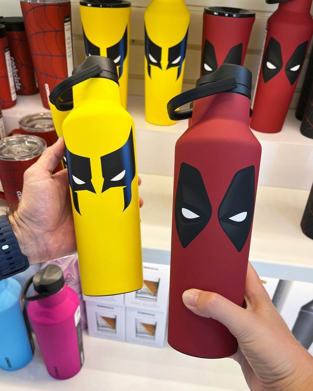 - Both a canteen and tumbler of Deadpool and Wolverine are now available, featuring sleek designs of each character’s masks on yellow for Wolverine and red for Deadpool.