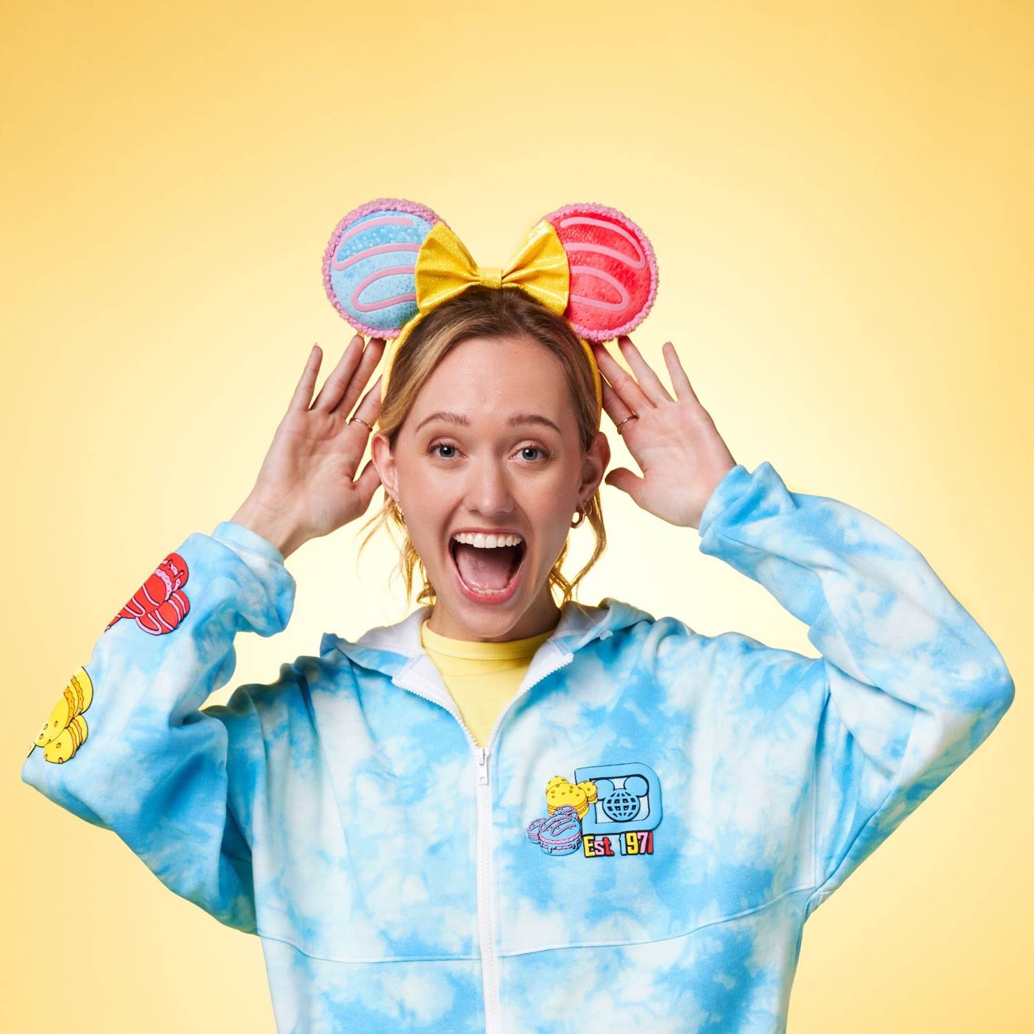- Finally, fans can complete the look with the Disney Eats Macaron Ear Headband, topped with a bright yellow bow nestled between fluffy-trimmed blue and red macaron ears.