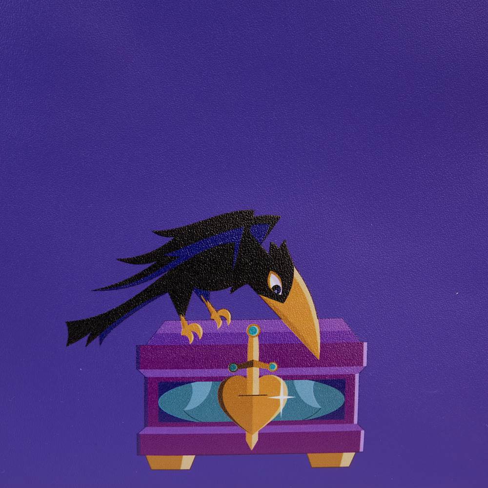 - The back of the wallet features flames and poison apple, while the mini backpack is accented with black straps and an image of the raven perched on the heart box.