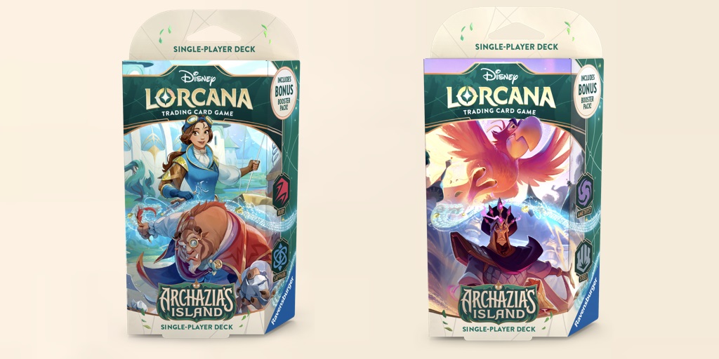 For Disney Lorcana: Archazia’s Island, Ravensburger is releasing two new starter decks (now branded as “single-player decks"). These include a Ruby/Sapphire combo featuring Belle and Beast on the cover as well as an Amethyst/Steel deck with Iago and Jafar. It is interesting that, this time around, both covers — which, per usual, also correspond to the two foil cards found in the starter decks — match in terms of property as this isn’t always the case.