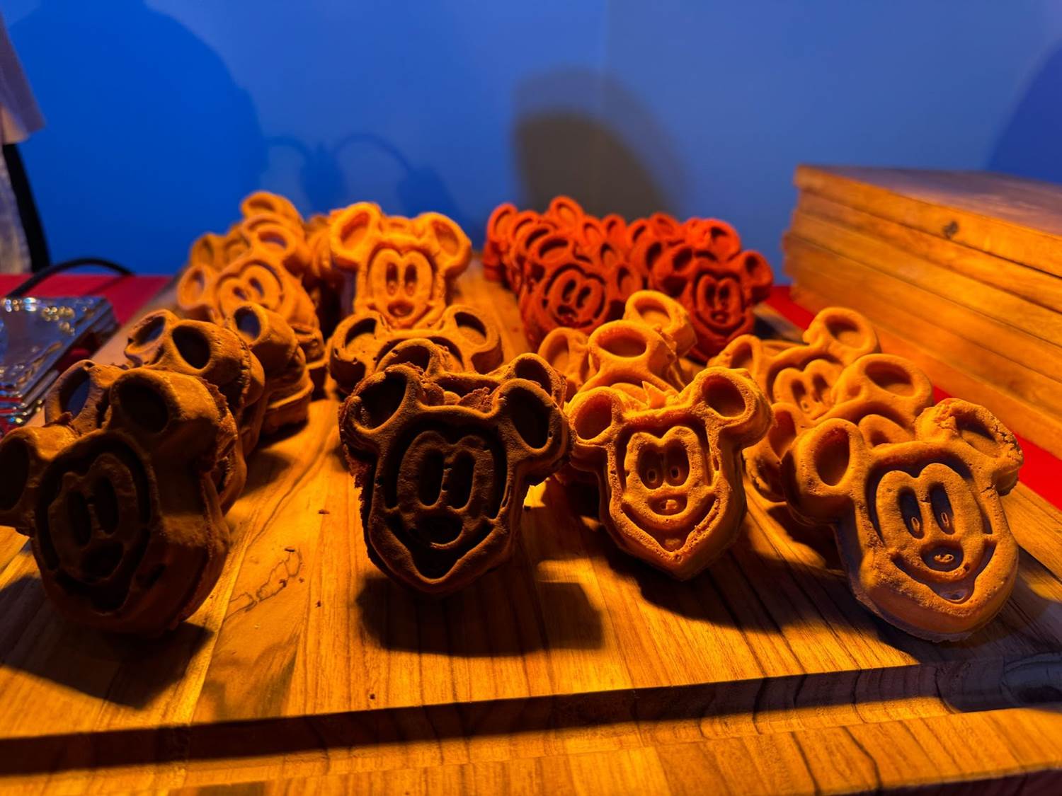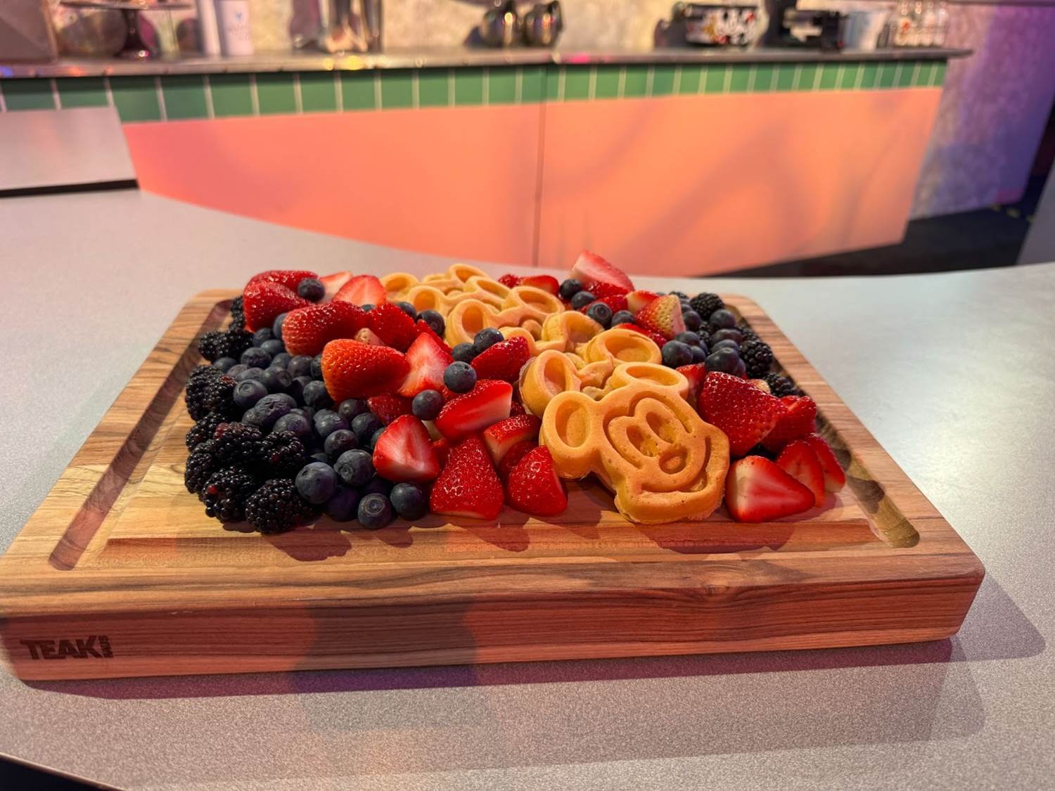 Disney Chefs premade waffles for an interactive waffle charcuterie board decorating activity. They had original, chocolate, cinnamon, and red velvet.