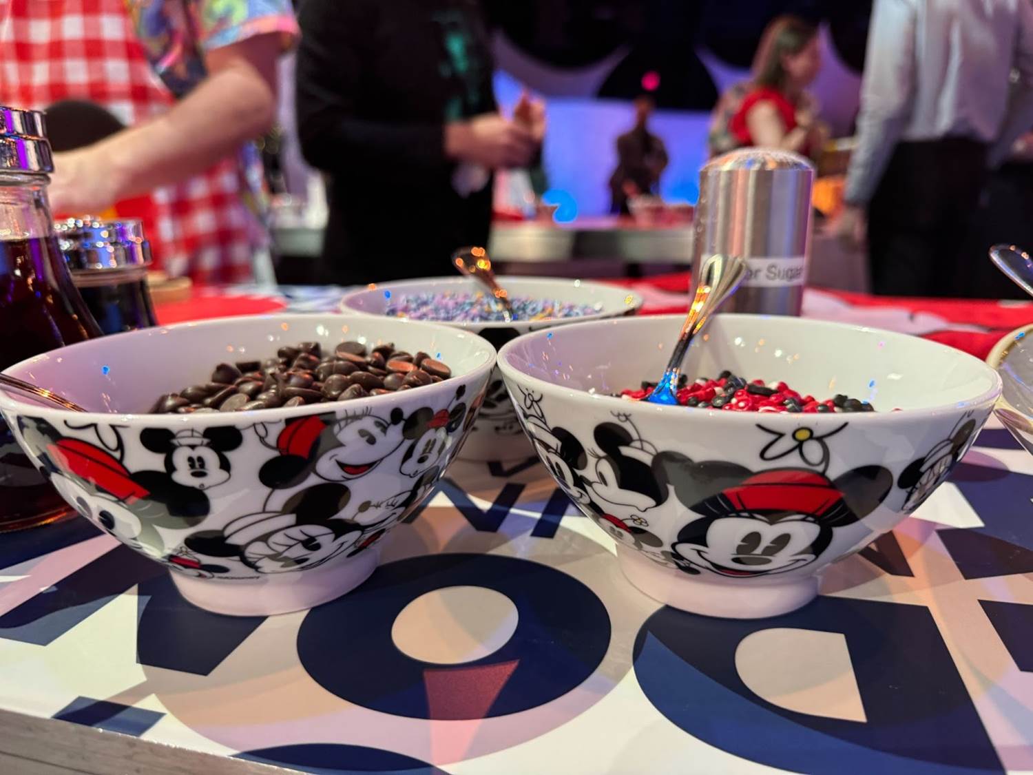 Minnie Mouse Soup Cereal Bowls were used to sprinkle toppings, one of which was Wilton Mickey Mouse Sprinkles.
