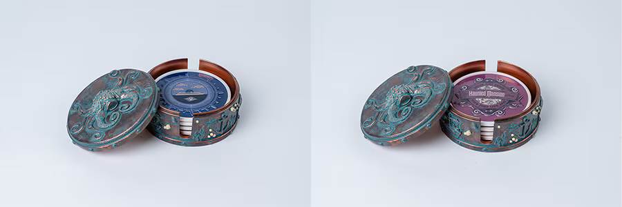 - Each unique piece of this porcelain coaster set will be decorated with graphic artwork inspired by Disney Treasure venues, including The Haunted Mansion Parlor, Skipper Society Lounge and Periscope Pub. The set will be encased by a three-dimensional, barnacle-encrusted box that will evoke the mysterious lore of Disney Parks.