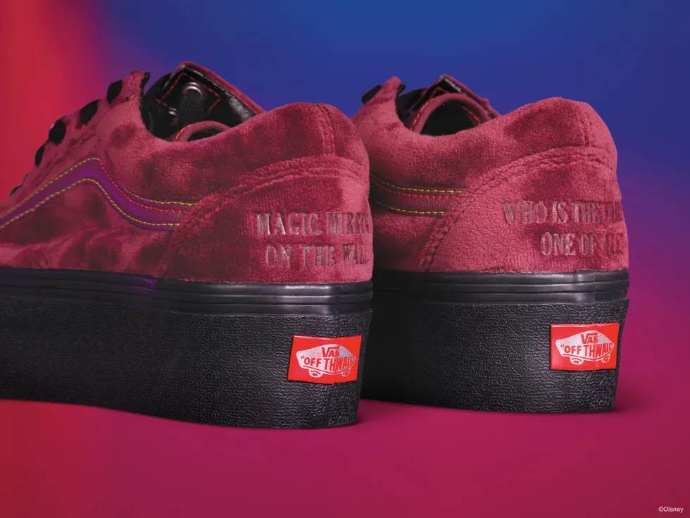 - The platform sole shoe with red velvet includes as a lace attachment the Evil Queen’s bony hand holding the fruit as well as embossed text on the heel: “Magic mirror on the wall, who is the fairest one of all?"