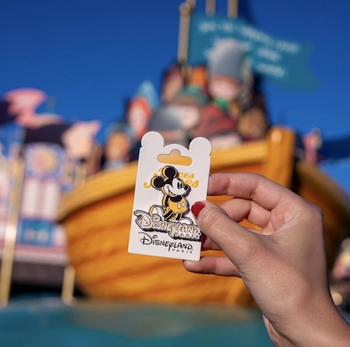- The Pièces Jaunes pin features a standing Mickey Mouse design, distinguished by his yellow shorts rather than the traditional red. The pin is inscribed with "Disneyland Paris" and is outlined in yellow.
