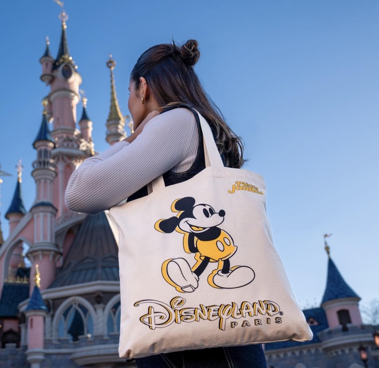 - The Pièces Jaunes tote bag showcases a standing Mickey Mouse and shares the same design as the pin.