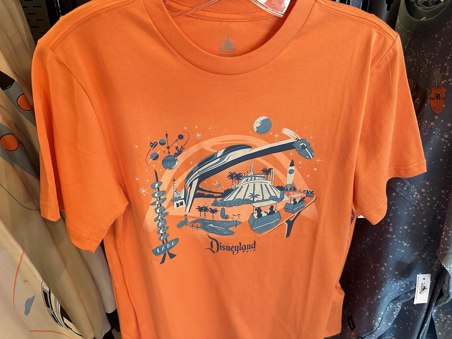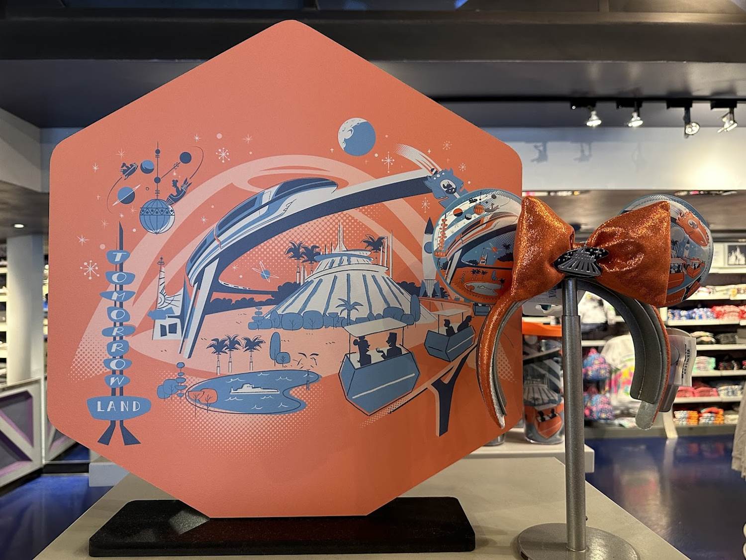 The usual suspects are present, with a mid-century designed collection of shirts, socks, and ears. The vibrant orange and blue color scheme harken back to the 1950s and 60s idea of what’s to come.