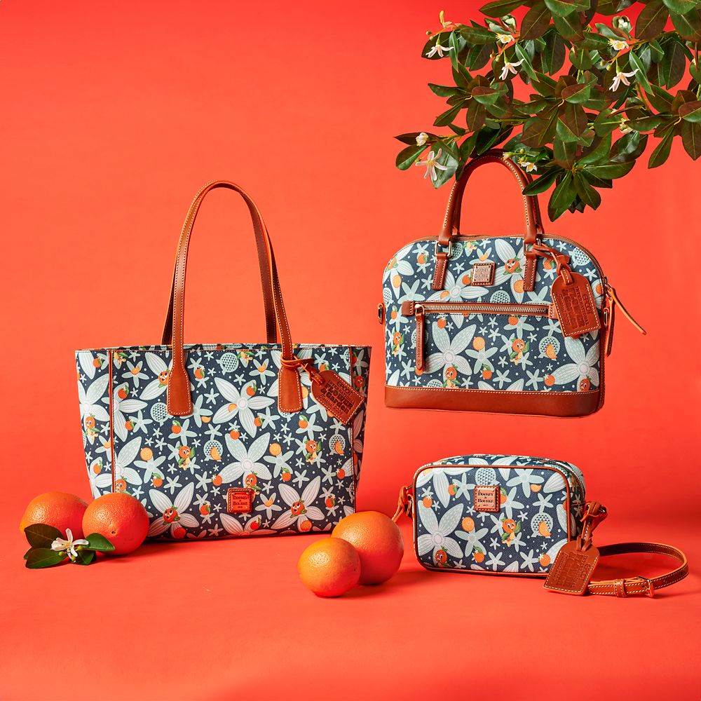 - The bag itself is light blue with a pattern made up of miniature icons of Spaceship Earth, oranges, seed packets, and garden rakes; and tying the whole look together is the orange trim, handle, and straps.