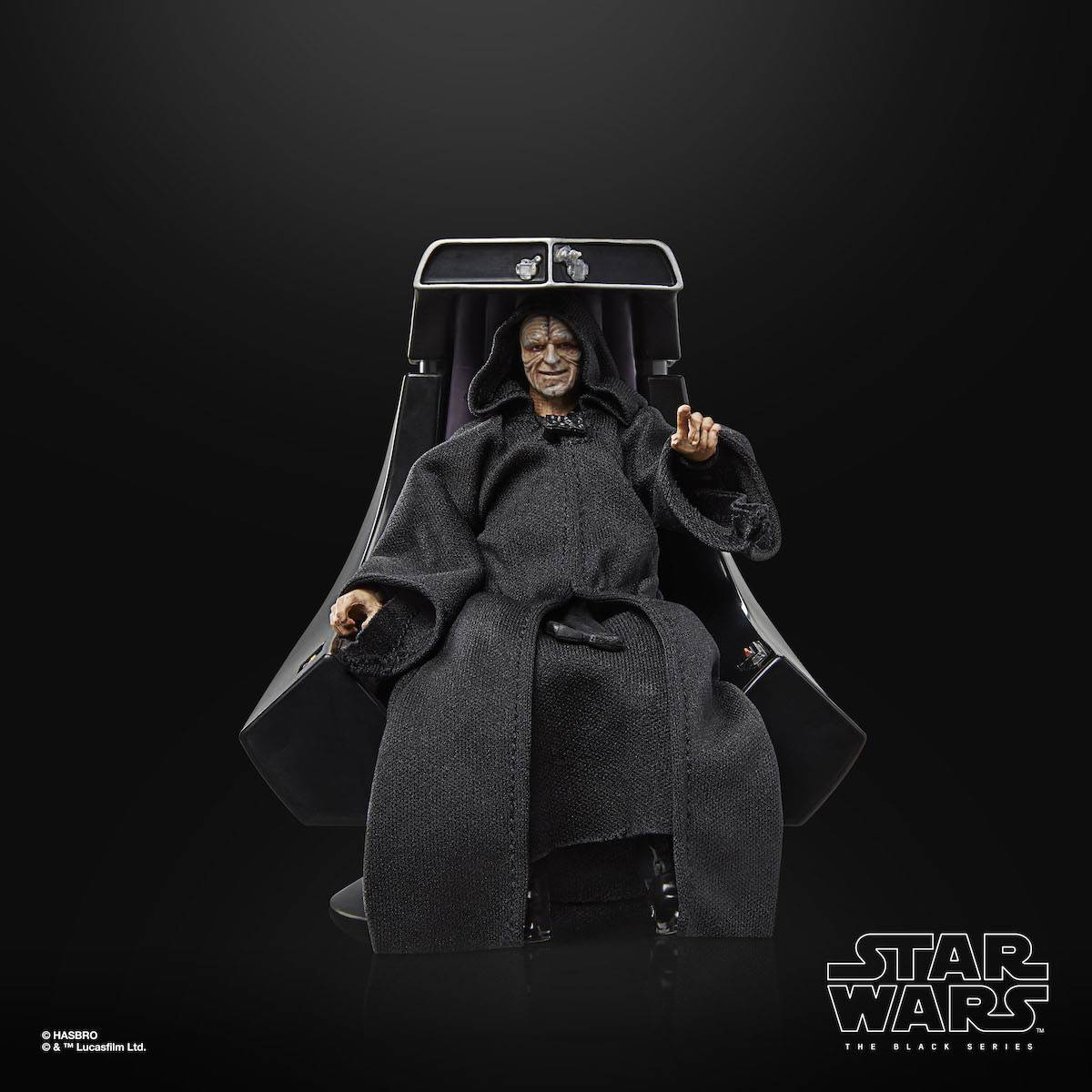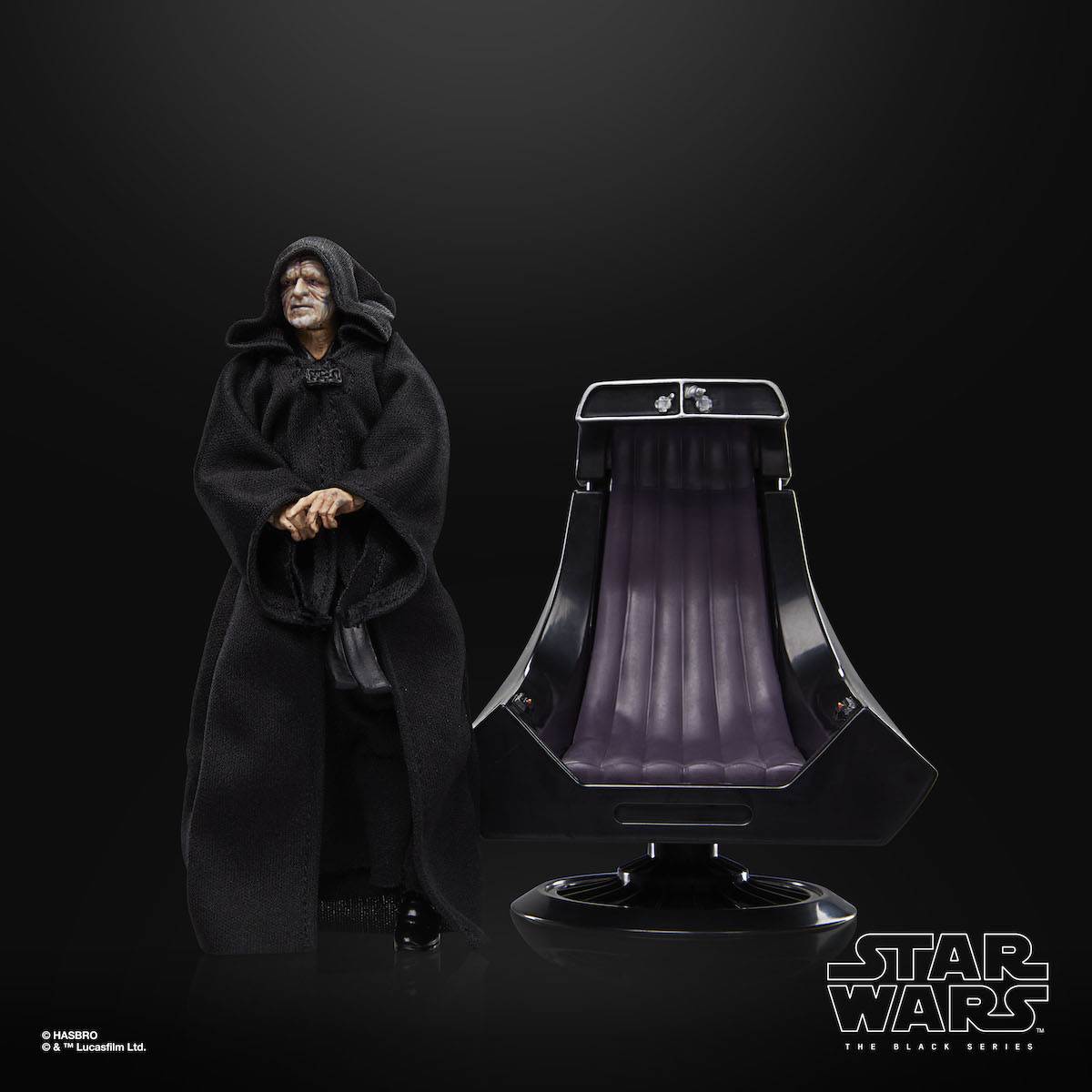 - Hasbro then jumps back to the Original Trilogy with a spotlight on Emperor Palpatine and his sleek black throne from the final battle in Return of the Jedi. The figure is dressed in his hooded robe and even features alternate hands with Force lightning.