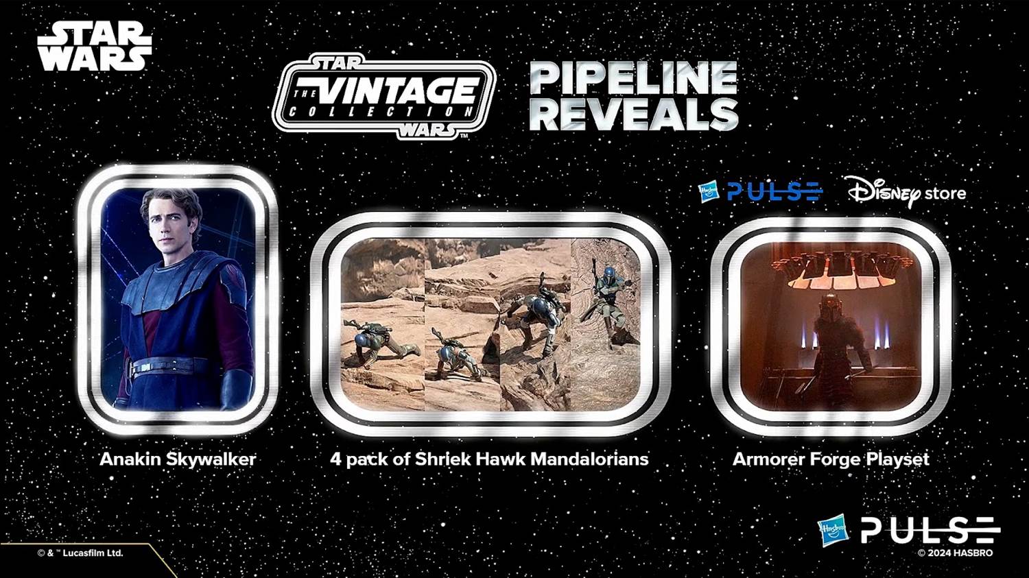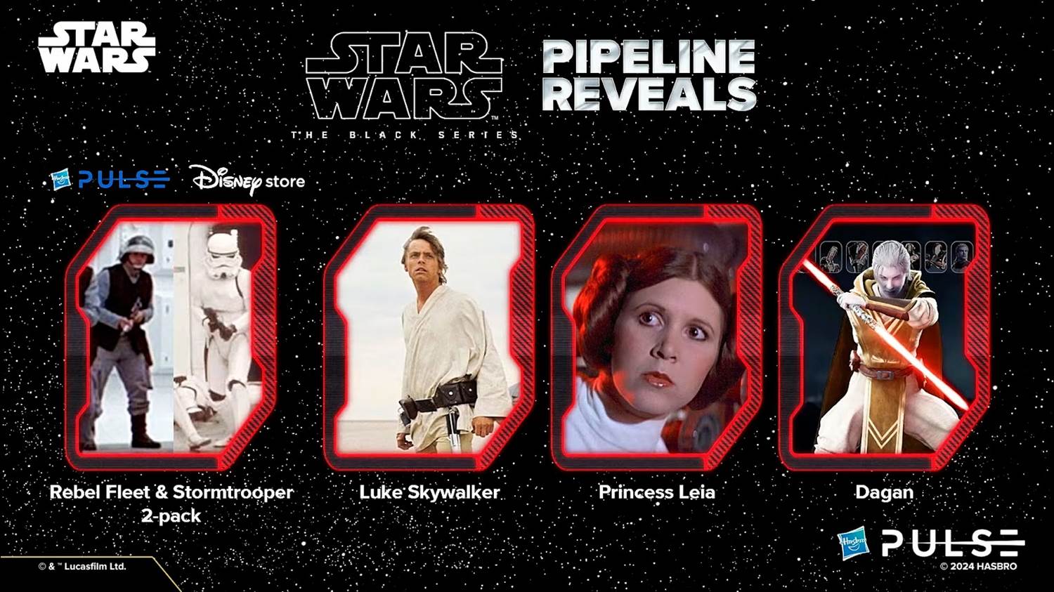 Pipeline reveals for The Black Series included a Rebel Fleet & Stormtrooper two-pack, Luke Skywalker and Princess Leia from Star Wars: Episode IV - A New Hope, and Dagan from the video game Star Wars: Jedi - Survivor. Meanwhile, The Vintage Collection pipeline reveals were Anakin Skywalker from Ahsoka, a four-pack of Shriek Hawk Mandalorians, and the Armorer Forge Playset from The Mandalorian.
