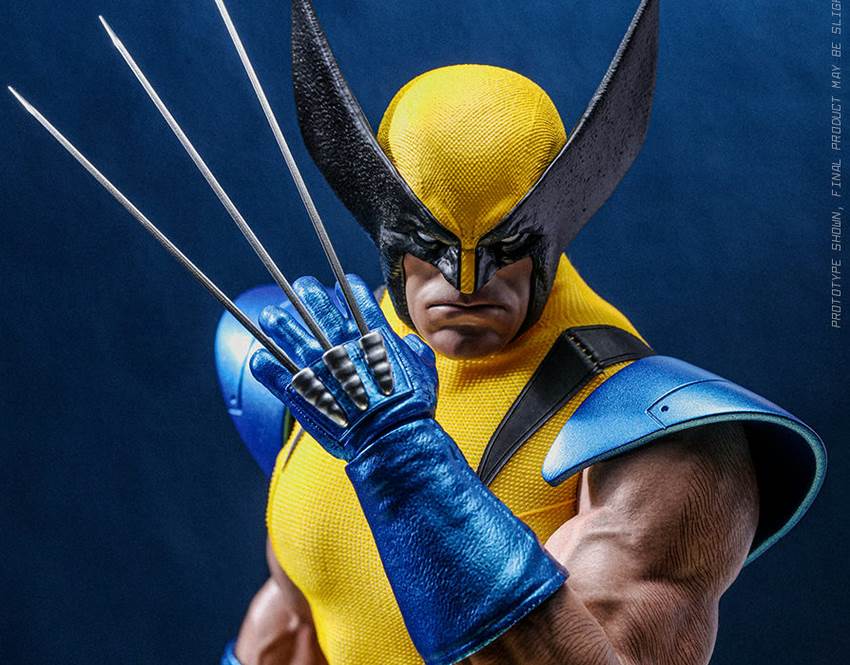 - This sixth-scale figure is in its vibrant yellow and metallic blue costume with animalistic stripes and multiple points of articulation, with seamless silicone arms to embody Wolverine’s muscular physique.